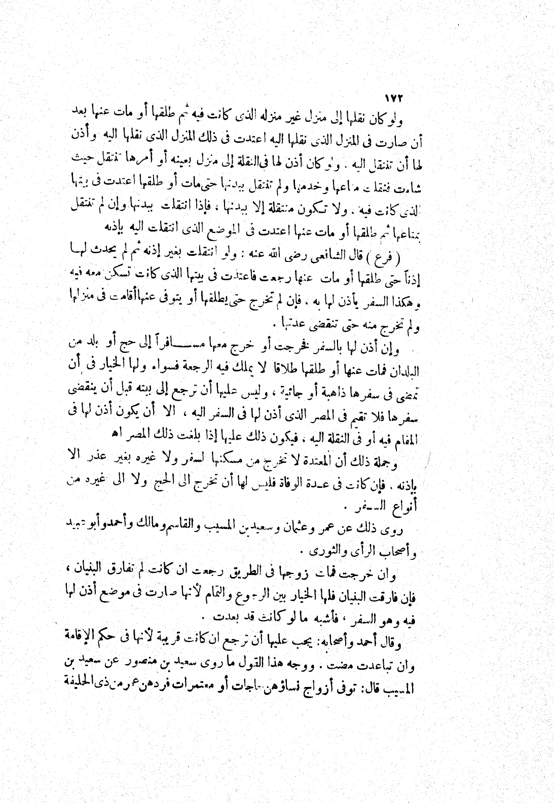 وإن أذن لها بالسفر فخرجت أو خرج معها مسافرا إلى حج أو بلد من البلدان فمات عنها أو طلقها طلاقا لا يملك فيه الرجعة فسواء ولها لخيار في أن تمضى في سفرها ذاهبة أو جائية، وليس عليها أن ترجع إلى بيته قبل أن ينقضى سفرها فلا تقيم في المصر الذي أذن لها في السفر إليه، الا أن يكون أذن لها في المقام فيه أو في النقلة إليه، فيكون ذلك عليها إذا بلغت ذلك المصر اه وجملة ذلك أن المعتدة لا تخرج من مسكنها لسفر ولا غيره بغير عذر الا بإذنه.