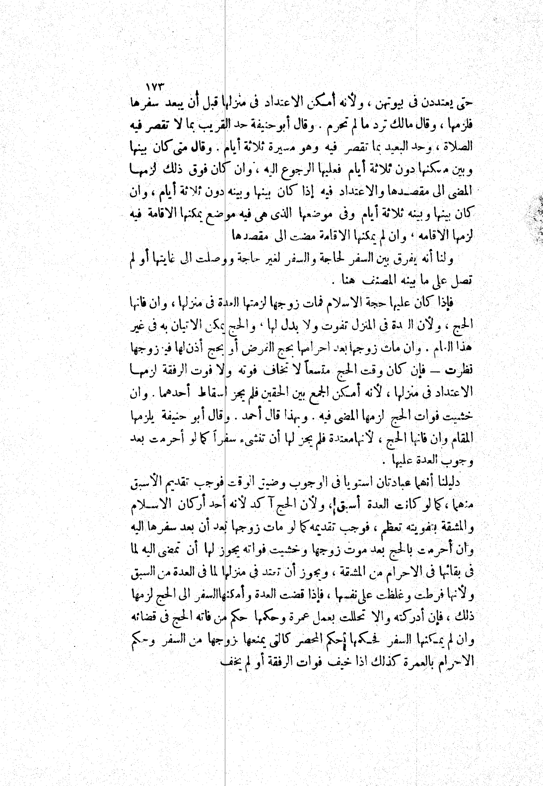 وقال متى كان بينها وبين مسكنها دون ثلاثة أيام فعليها الرجوع إليه، وان كان فوق ذلك لزمها المضى إلى مقصدها والاعتداد فيه إذا كان بينها وبينه دون ثلاثة أيام، وان كان بينها وبينه ثلاثة أيام وفي موضعها الذي هي فيه موضع يمكنها الاقامة فيه لزمها الاقامة، وان لم يمكنها الاقامة مضت إلى مقصدها ولنا أنه يفرق بين السفر لحاجة والسفر لغير حاجة ووصلت إلى غايتها أو لم تصل على ما بينه المصنف هنا.