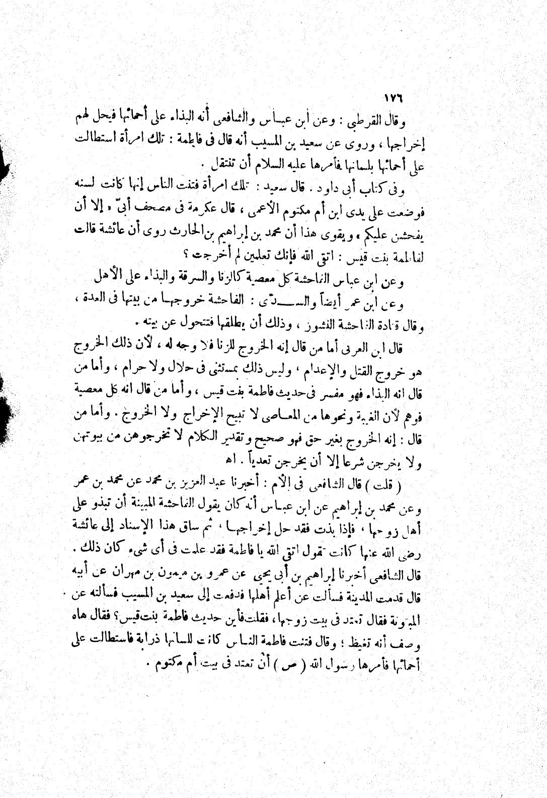 أه (قلت) قال الشافعي في الام: أخبرنا عبد العزيز بن محمد عن محمد بن عمر وعن محمد بن إبراهيم عن ابن عباس أنه كان يقول الفاحشة المبينة أن تبذو على أهل زوجها، فإذا بذت فقد حل إخراجها، ثم ساق هذا الاسناد إلى عائشة رضى الله عنها كانت تقول اتقى الله يا فاطمة فقد علمت في أي شئ كان ذلك.