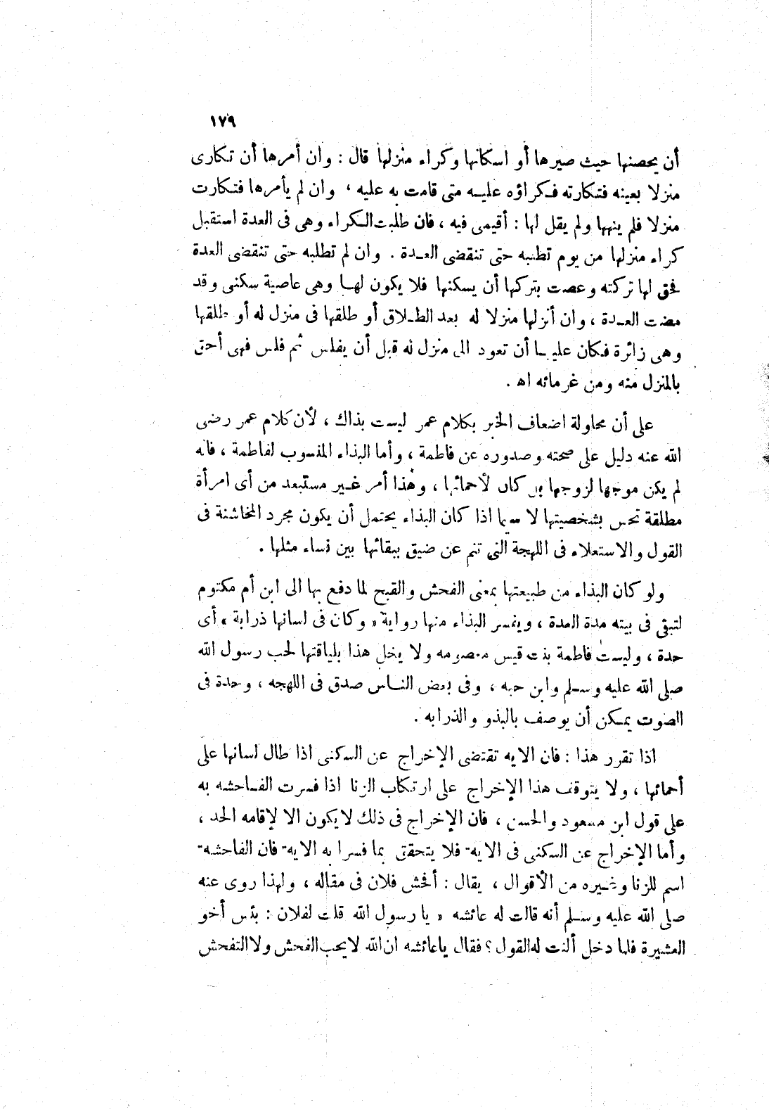 ولو كان البذاء من طبيعتها بمعنى الفحش القبح لما دفع بها إلى ابن أم مكتوم لتبقى في بيته مدة العدة، ويفسر البذاء منها رواية " وكان في لسانها ذرابة " أي حدة، وليست فاطمة بنت قيس معصومه ولا يخل هذا بليقاتها لحب رَسُولِ اللَّهِ صَلَّى اللَّهُ عَلَيْهِ وَسَلَّمَ وَابْنُ حبه، وفي بعض الناس صدق في اللهجه، وحدة في الصوت يمكن أن يوصف بالبذو والذرابه إذا تقرر هذا: فان الايه تقتضي الاخراج عن السكنى إذا طال لسانها على أحمائها، ولا يتوقف هذا الاخراج على ارتكاب الزنا إذا فسرت الفاحشة به على قول ابن مسعود والحسن، فان الاخراج في ذلك لا يكون الا لاقامة الحد، أما الاخراج عن السكنى في الاية فلا يتحقق بما فسرا به الاية فان الفاحشة اسم للزنا وغيره من الاقوال، يقال: أفحش فلان في مقاله، ولهذا روى عنه صلى الله عليه وسلم أنه قالت له عائشة " يارسول الله قلت لفلان: بئس أخو العشيرة فلما دخل ألفت له القول؟ فقال يا عائشة ان الله لا يحب الفحش ولا التفحش