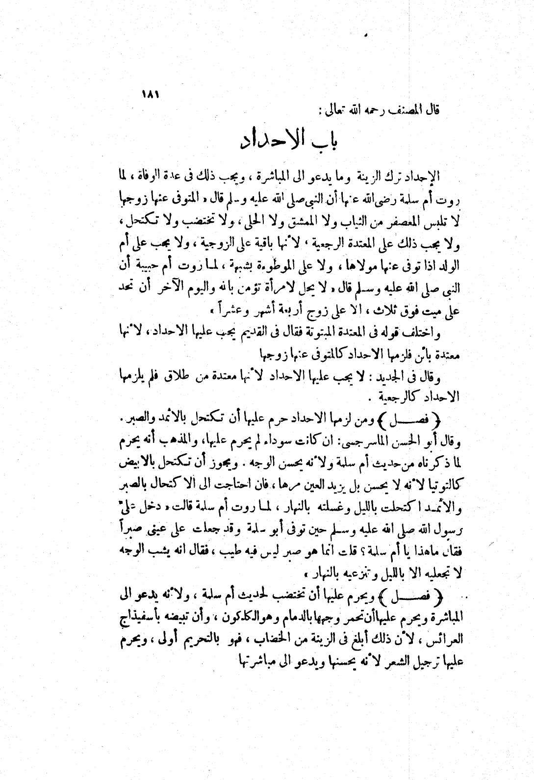 الولد إذا توفى عنها مولاها، ولا على الموصوءة بشبهة، لما روت أُمِّ حَبِيبَةَ إنَّ النَّبِيَّ صَلَّى اللَّهُ عَلَيْهِ وَسَلَّمَ قَالَ " لَا يَحِلُّ لِامْرَأَةٍ تُؤْمِنُ بِاَللَّهِ وَالْيَوْمِ الْآخِرِ أن تحد على ميت فوق ثلاث، الا على زوج أربعة أشهر وعشرا " واختلف قوله في المعتدة المبتوتة فقال في القديم يجب عليها الاحداد، لانها معتدة بائن فلزمها الاحداد كالمتوفى عنها زوجها وقال في الجديد: لا يجب عليها الاحداد لانها معتدة من طلاق فلم يلزمها الاحداد كالرجعية.