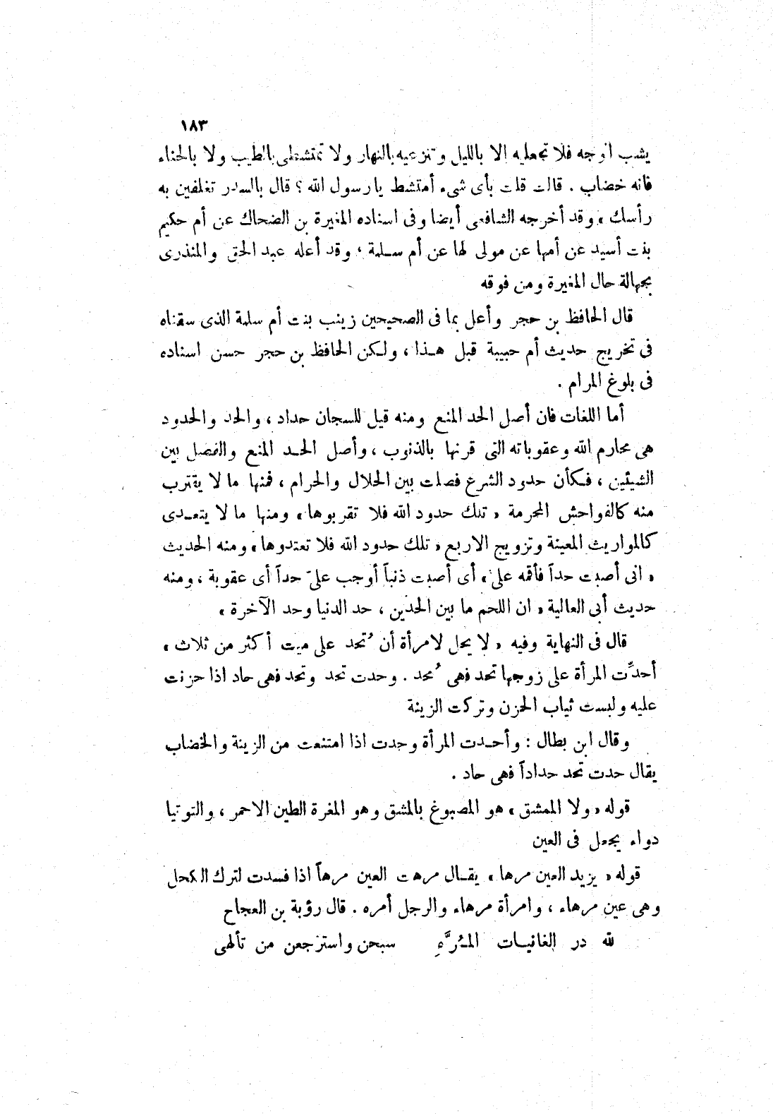 قالت قلت بأى شئ أمتشط يارسول الله؟ قال بالسدر تغلفين به رأسك " وقد أخرجه الشافعي أيضا وفي اسناده المغيرة بن الضحاك عن أم حكيم بنت أسيد عن أمها عن مولى لها عن أم سلمة، وقد أعله عبد الحق والمنذري بجهالة حال المغيرة ومن فوقه قال الحافظ بن حجر وأعل بما في الصحيحين زينب بنت أم سلمة الذي سقناه في تخريج حديث أم حبيبة قبل هذا، ولكن الحافظ بن حجر حسن اسناده في بلوغ المرام.