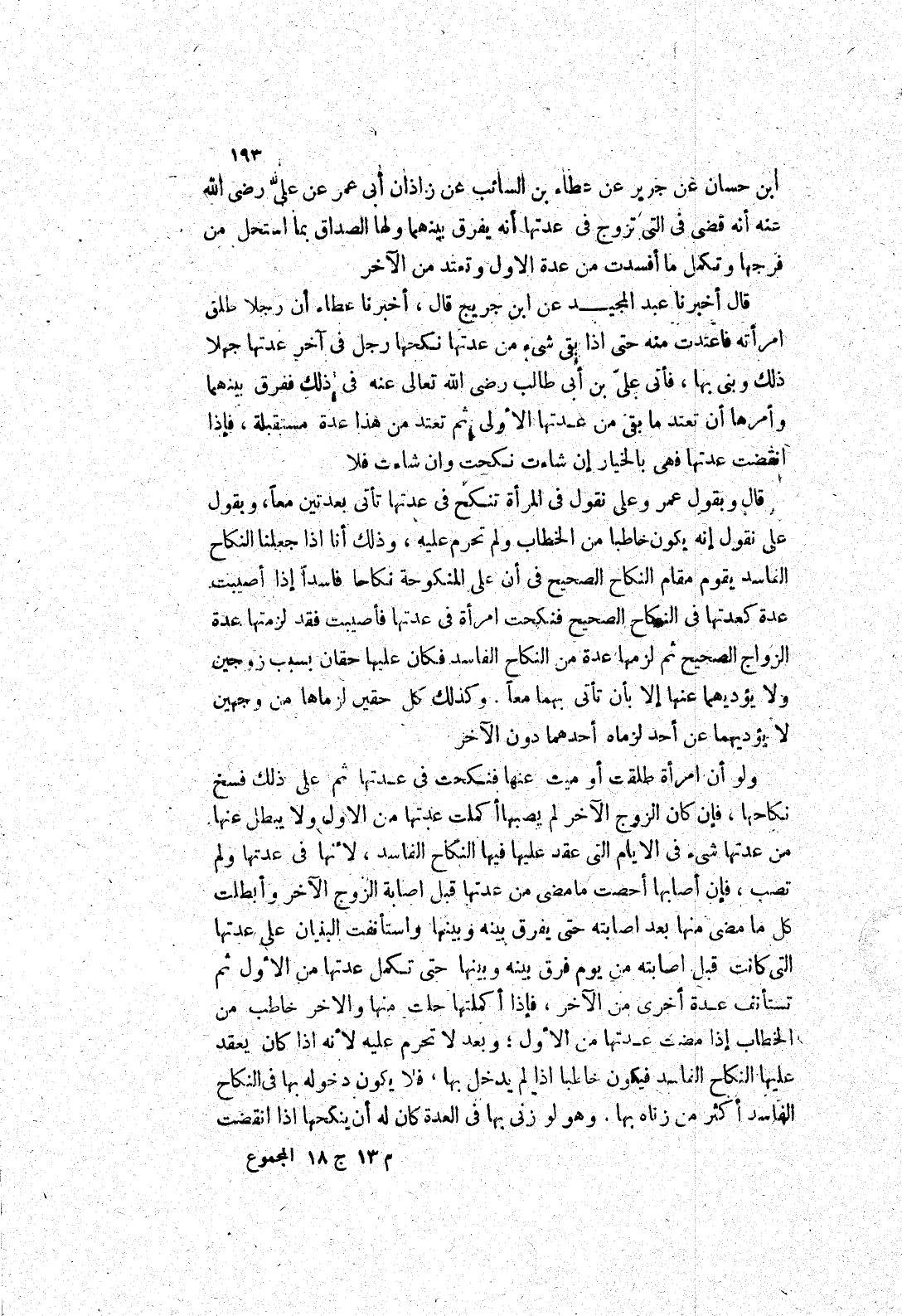 ابن حسان عن جرير عن عطاء بن السائب عن زاذان أبى عمر عن علي رضى الله عنه أنه قضى في التي تزوج في عدتها أنه يفرق بينهما ولها الصداق بما استحل من فرجها وتكمل ما أفسدت من عدة الاول وتعتد من الآخر قال أَخْبَرَنَا عَبْدُ الْمَجِيدِ عَنْ ابْنِ جُرَيْجٍ قَالَ، أخبرنا عطاء أن رجلا طلق امرأته فاعتدت منه حتى إذا بقي شئ من عدتها نكحها رجل في آخر عدتها جهلا ذلك وبنى بها، فأتى عَلِيِّ بْنِ أَبِي طَالِبٍ رَضِيَ اللَّهُ تَعَالَى عنه في ذلك ففرق بينهما وأمرها أن تعتد ما بقى من عتدها الاولى ثم تعتد من هذا عدة مستقبلة، فإذا انقضت عدتها فهي بالخيار إن شاءت نكحت وإن شاءت فلا قال وبقول عمر وعلى نقول في المرأة تنكح في عدتها تأتى بعدتين معا، وبقول على نقول إنه يكون خاطبا من الخطاب ولم تحرم عليه، وذلك أنا إذا جعلنا النكاح