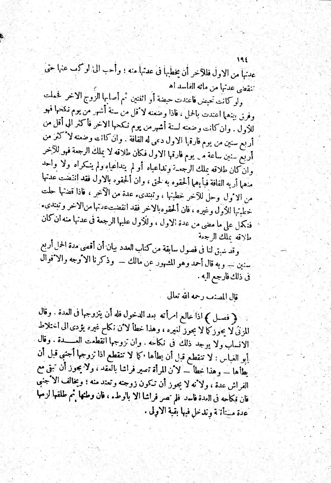 أربع سنين ساعة من يوم فارقها الاول فكان طلاقه لا يملك الرجعة فهو للآخر وان كان طلاقه يملك الرجعة وتداعياه أو لم يتداعياه ولم ينكراه ولا واحد منهما أريه القافة فبأيهما ألحقوه به لحق، وان ألحقوه بالاول فقد انقضت عدتها من الاول وحل للآخر خطبتها، وتبتدئ عدة من الآخر، فإذا قضتها حلت خطبتها للاول وغيره، فان ألحقوه بالاخر فقد انقضت عدتها من الاخر وتبتدئ فتكمل على ما مضى من عدة الاول، وللاول عليها الرجعة في عدتها منه ان كان طلاقه يملك الرجعة وقد سبق لنا في فصول سابقة من كتاب العدد بيان أن أقصى مدة الحمل أربع سنين - وبه قال أحمد وهو المشهور عن مالك - وذكرنا الاوجه والاقوال في ذلك فارجع إليه.