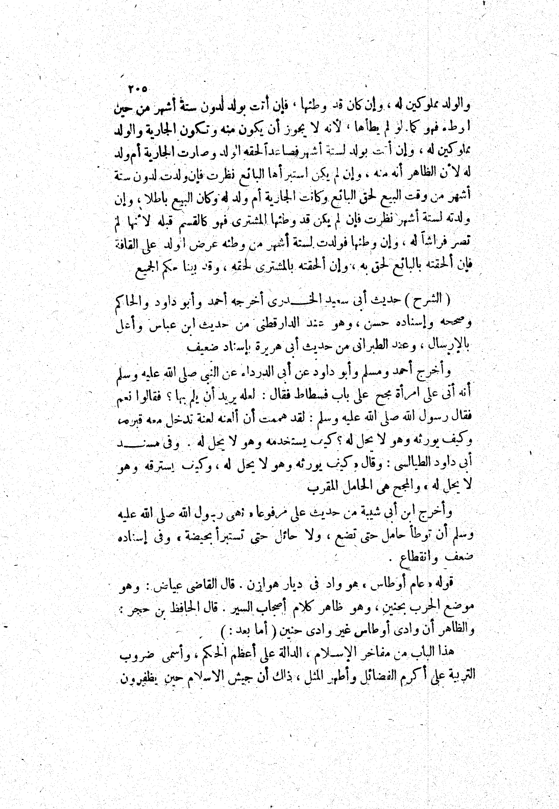 وفي مسند أبى داود الطيالسي: وقال " كيف يورثه وهو لا يحل له، وكيف يسترقه وهو لا يحل له " والمجح هي الحامل المقرب وأخرج ابن أبى شيبة من حديث على مرفوعا " نَهَى رَسُولُ اللَّهِ صَلَّى اللَّهُ عَلَيْهِ وَسَلَّمَ إنَّ توطأ حامل حتى تضع، ولا حائل حتى تستبرأ بحيضة " وفي إسناده ضعف وانقطاع.
