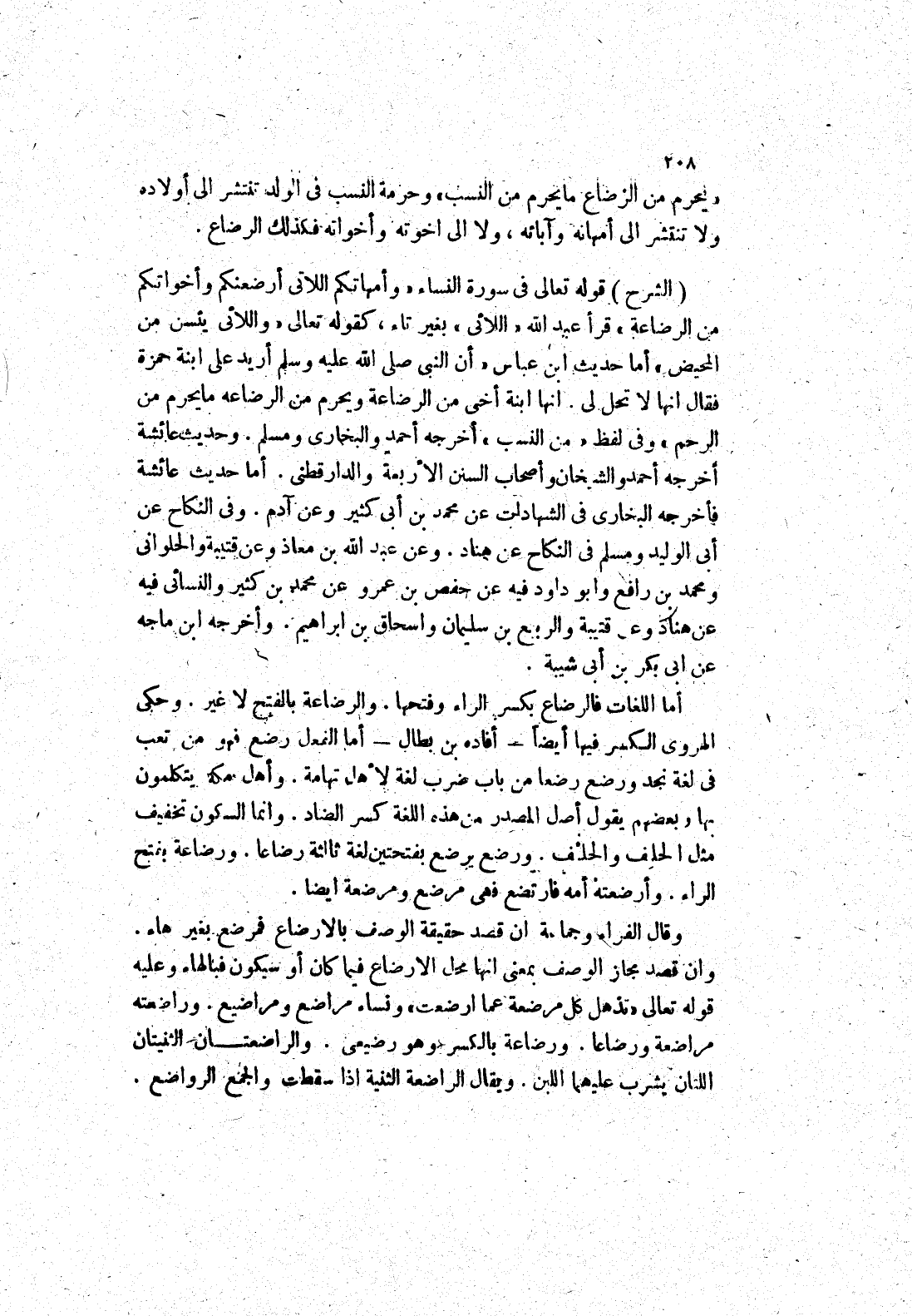 (الشرح) قوله تعالى في سورة النساء " وأمهاتكم اللاتى أرضعنكم وأخواتكم من الرضاعة " قرأ عبد الله " اللائى " بغير تاء، كقوله تعالى " واللائى يئسن من المحيض " أما حَدِيثُ ابْنِ عَبَّاسٍ " أَنَّ النَّبِيَّ صَلَّى اللَّهُ عَلَيْهِ وسلم أريد على ابنة حمزة فقال انها لا تحل لى.