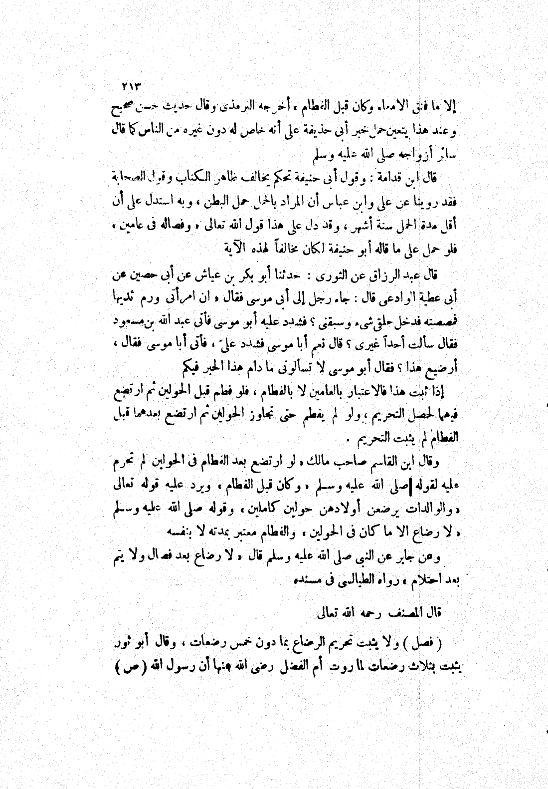 سائر أزواجه صلى الله عليه وسلم قال ابن قدامة: وقول أبى حنيفة تحكم يخالف ظاهر الكتاب وقول الصحابة فقد روينا عن على وابن عباس أن المراد بالحمل حمل البطن، وبه استدل على أن أقل مدة الحمل ستة أشهر، وقد دل على هذا قول الله تعالى " وفصاله في عامين " فلو حمل على ماقاله أبو حنيفة لكان مخالفا لهذه الآية قال عبد الرزاق عن الثوري: حدثنا أبو بكر بن عياش عن أبى حصين عن أبى عطية الوادعى قال: جاء رجل إلى أبى موسى فقال " ان امرأتي ورم ثديها فمصصته فدخل حلقى شئ وسبقني؟ فشدد عليه أبو موسى فأتى عبد الله بن مسعود فقال سألت أحدا غيرى؟ قال نعم أبا موسى فشدد على، فأتى أبا موسى فقال، أرضيع هذا؟ فقال أبو موسى لا تسألوني ما دام هذا الحبر فيكم إذا ثبت هذا فالاعتبار بالعامين لا بالفطام، فلو فطم قبل الحولين ثم ارتضع فيها لحصل التحريم، ولو لم يفطم حتى تجاوز الحولين ثم ارتضع بعدهما قبل الفطام لم يثبت التحريم.