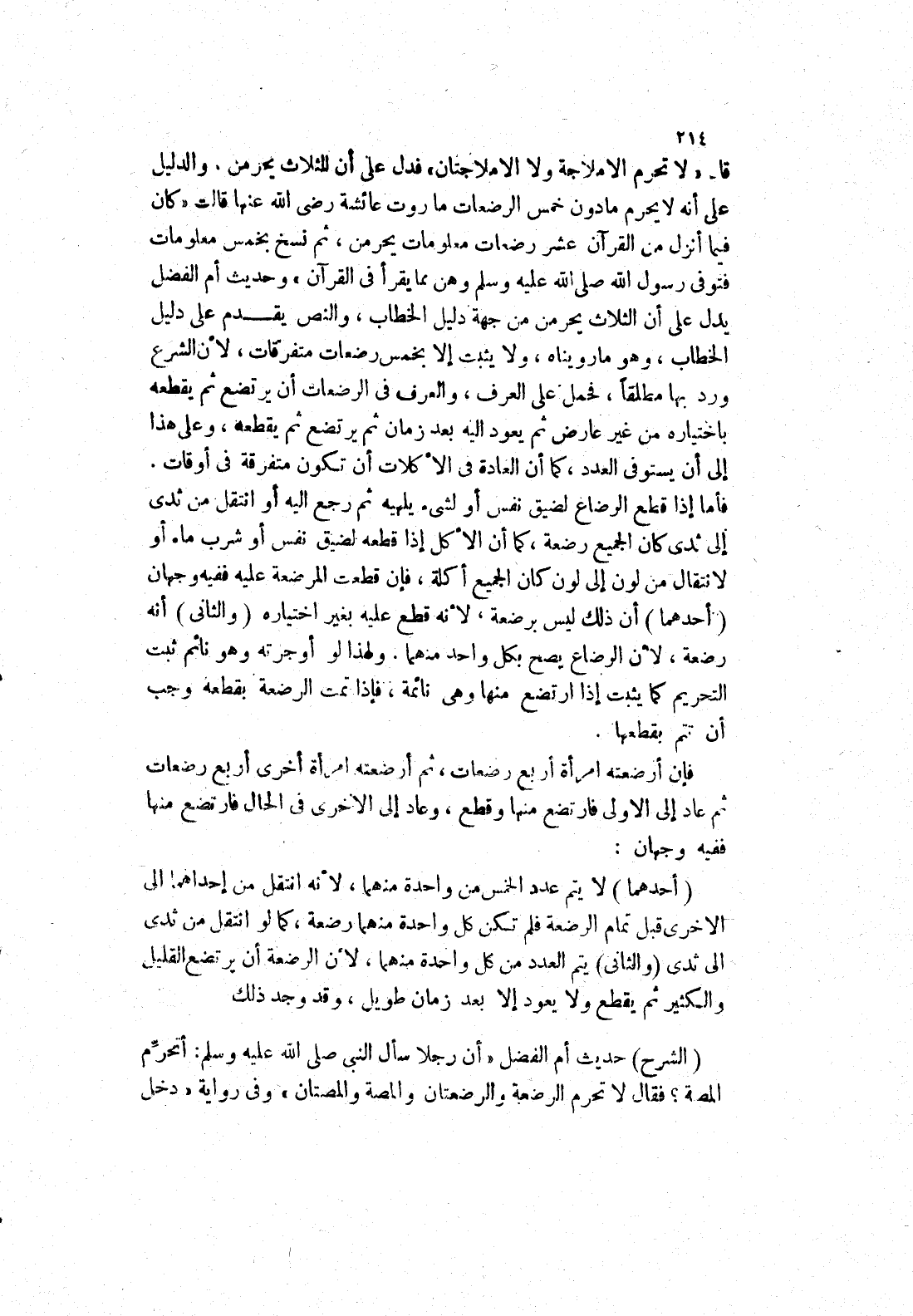 قال " لا تحرم الا ملاجة ولا الا ملاجتان " فدل على أن الثلاث يحرمن، والدليل على أنه لا يحرم ما دون خمس الرضعات ماروت عائشة رضى الله عنها قالت " كان فيما أنزل من القرآن عشر رضعات معلومات يحرمن، ثم نسخ بخمس معلومات فتوفى رسول الله صلى الله عليه وسلم وهن مما يقرأ في القرآن، وحديث أم الفضل يدل على أن الثلاث يحرمن من جهة دليل الخطاب، والنص يقدم على دليل الخطاب، وهو مارويناه، ولا يثبت إلا بخمس رضعات متفرقات، لان الشرع ورد بها مطلقا، فحمل على العرف، والعرف في الرضعات أن يرتضع ثم يقطعه باختياره من غير عارض ثم يعود إليه بعد زمان ثم يرتضع ثم يقطعه، وعلى هذا إلى أن يستوفي العدد، كما أن العاده في الاكلات أن تكون متفرقة في أوقات.