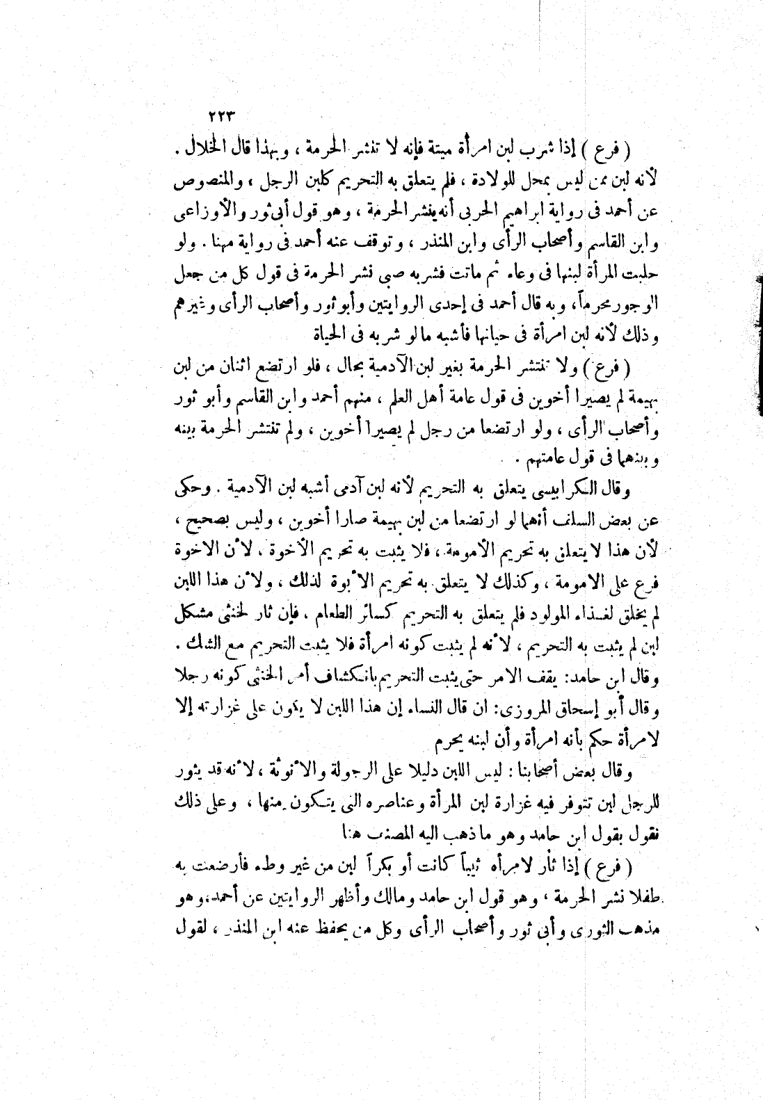 وقال ابن حامد: يقف الامر حتى يثبت التحريم بانكشاف أمر الخنثى كونه رجلا وقال أبو إسحاق المروزى: أن قال النساء إن هذا اللبن لا يكون على غزارته إلا لامرأة حكم بأنه امرأة وأن لبنه يحرم وقال بعض أصحابنا: ليس اللبن دليلا على الرجولة والانوثة، لانه قد يثور للرجل لبن تتوفر فيه غزارة لبن المرأة وعناصره التى يتكون منها، وعلى ذلك نقول بقول ابن حامد وهو ما ذهب إليه المصنف هنا (فرع)