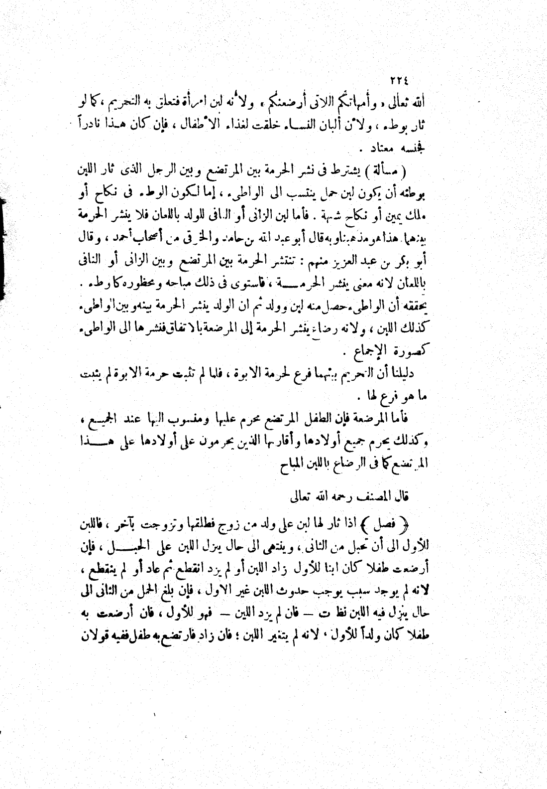 (مسألة) يشترط في نشر الحرمة بين المرتضع وبين الرجل الذى ثار اللبن بوطئه أن يكون لبن حمل ينتسب إلى الواطئ، إما لكون الوطئ في نكاح أو ملك يمين أو نكاح شبهة.