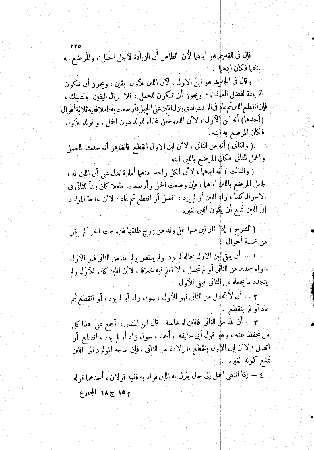 أنه من الثاني، لان لبن الاول انقطع فالظاهر أنه حدث للحمل والحمل للثاني فكان المرضع باللبن أبنه (والثالث) أنه ابنهما، لان لكل واحد منهما أمارة تدل على أن اللبن له، فجعل المرضع باللبن ابنهما، فإن وضعت الحمل وأرضعت طفلا كان إبنا للثاني في الاحوال كلها، زاد اللبن أو لم يزد، اتصل أو انقطع ثم عاد، لان حاجة المولود إلى اللبن تمنع أن يكون اللبن لغيره (الشرح) إذا ثار لبن منها على ولده من زوج طلقها فتزوجت أخر لم يخل من خمسة أحوال: 1 - أن يبقى لبن الاول بحاله لم يزد ولم ينقص ولم تلد من الثاني فهو للاول سواء حملت من الثاني أو لم تحمل، لا نعلم فيه خلافا، لان اللبن كان للاول ولم يتجدد ما يجعله من الثاني فبقى للاول 2 - أن لاتحمل من الثاني فهو للاول، سواء زاد أو لم يزد، أو انقطع ثم عاد أو لم ينقطع.