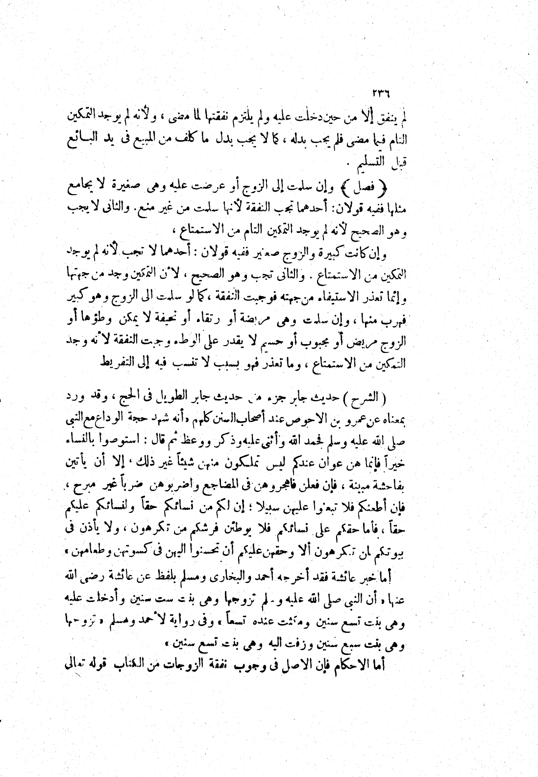 والثانى تجب وهو الصحيح لان التمكين وجد من جهتها وإئما تعذر الاستيفاء من جهته فوجبت النفقة، كما لو سلمت إلى الزوج وهو كبير فهرب منها، وإن سلمت وهى مريضة أو رتفاء أو نحيفة لا يمكن وطؤها أو الزوج مريض أو مجبوب أو حسيم لا يقدر على الوطئ وجبت النفقة لانه وجد التمكين من الاستمتاع، وما تعذر فهو بسبب لاتنسب فيه إلى التفريط (الشرح) حديث جابر جزء من حديث جابر الطويل في الحج، وقد ورد بمعناه عن عمرو بن الاحوص عند أصحاب السنن كلهم " أنه شهد حجة الوداع مع النبي صلى الله عليه وسلم فحمد الله وأثنى عليه وذكر ووعظ ثم قال، استوصوا بالنساء خيرا فإنما هن عوان عندكم ليس تملكون منهن شيئا غير ذلك، إلا أن يأتين بفاحشة مبينة، فإن فعلن فاهجروهن في المضاجع واضربوهن ضربا غير مبرح، فإن أطعنكم فلا تبعنوا عليهن سبيلا إن لكم من نسائكم حقا ولنسائكم عليكم حقا، فأما حقكم على نسائكم فلا يوطئن فرشكم من تكرهون، ولا يأذن في بيوتكم لمن تكرهون ألا وحقهن عليكم أن تحسنوا اليهن في كسوتهن وطعامهن "