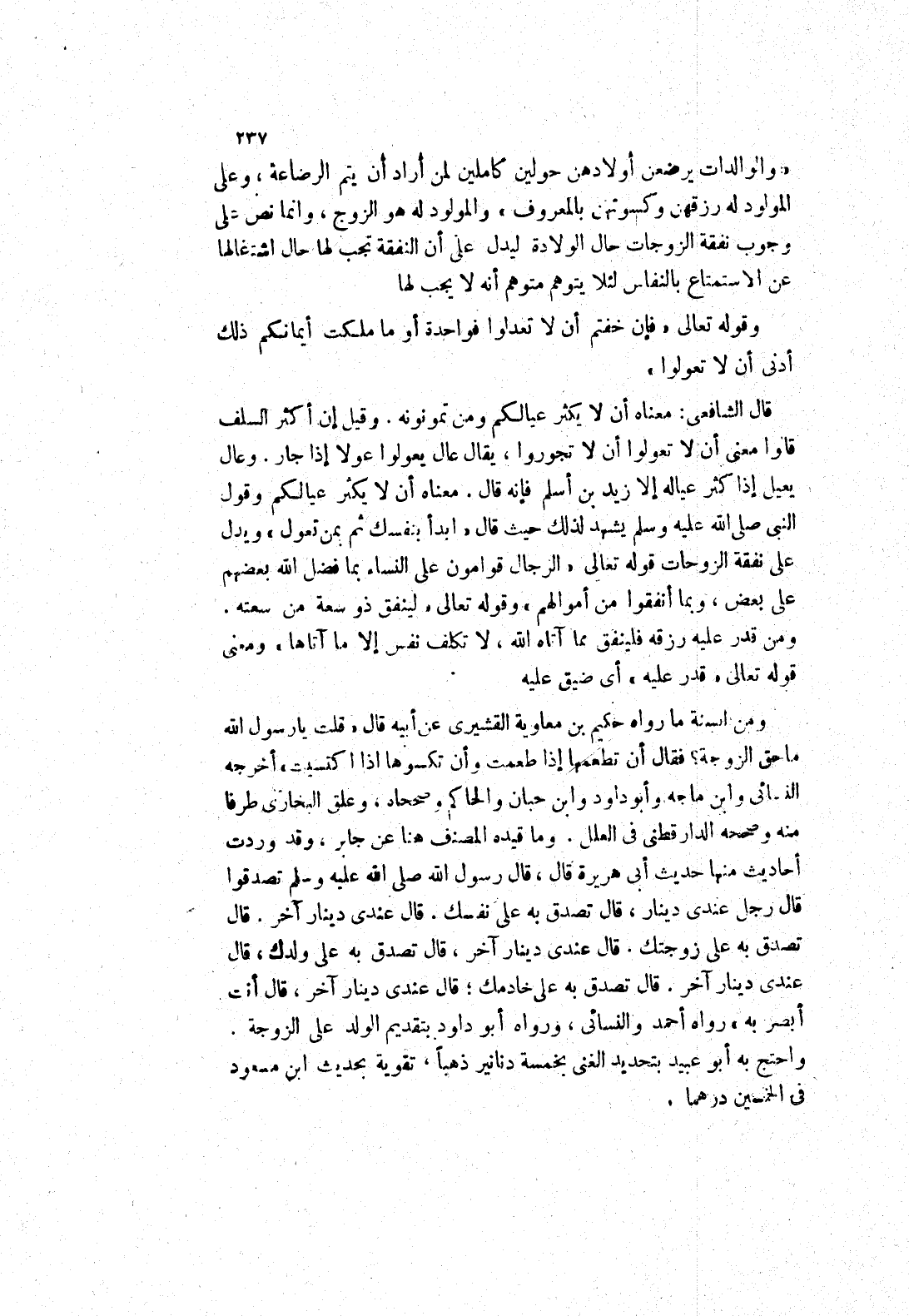 والوالدات يرضعن أولادهن حولين كاملين لمن أراد أن يتم الرضاعة، وعلى المولود له رزقهن وكسوتهن بالمعروف " والمولود له هو الزوج، وانما نص على وجوب نفقة الزوجات حال الولادة ليدل على أن النفقة تجب لها حال اشتغالها عن الاستمتاع بالنفاس لئلا يتوهم متوهم أنه لا يجب لها وقوله تعالى " فإن خفتم أن لاتعدلوا فواحدة أو ما ملكت أيمانكم ذلك أدنى أن لا تعولوا " قال الشافعي: معناه أن لا يكثر عيالكم ومن تمونونه.