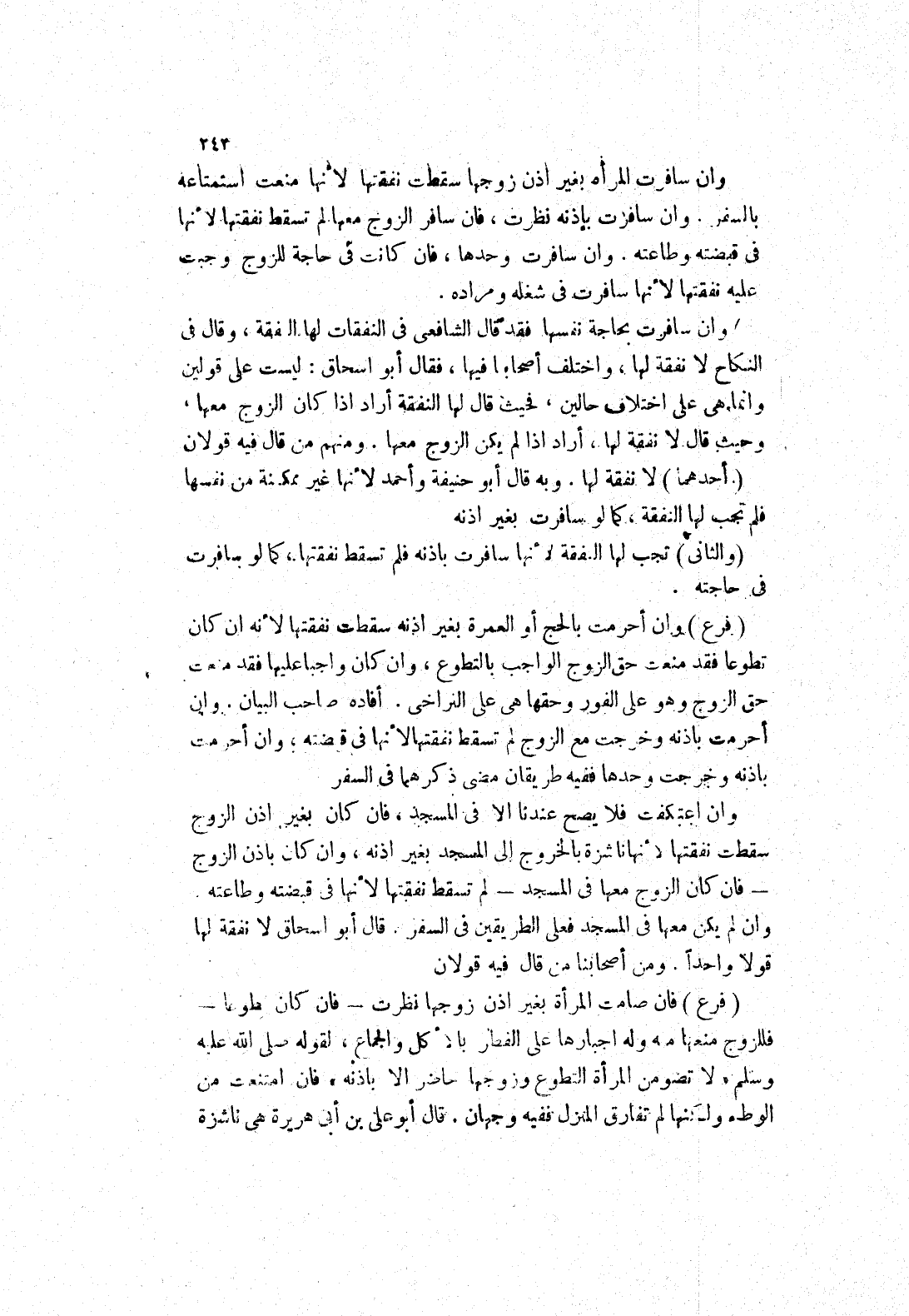 وان سافرت المرأه بغير اذن زوجها سقطت نفقتها لانها منعت استمتاعه بالسفر.