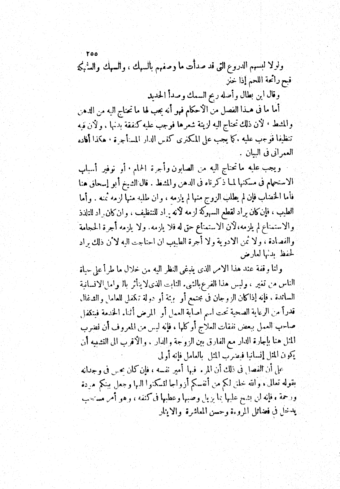 ولنا وفقة عند هذا الامر الذي ينبغى النظر إليه من خلال ما طرأ على حياة الناس من تغير، وليس هذا الفرع بالشئ الثابت الذي لا يتأثر بالعوامل الانسانية السائدة، فإنه إذا كان الزوجان في مجمتع أو بيئة أو دولة تكفل للعامل والشغال قدرا من الرعاية الصحية تحت اسم اصابة العمل أو المرض أثناء الخدمة فيتكفل صاحب العمل ببعض نفقات العلاج أو كلها، فإنه ليس من العروف أن لضرب المثل هنا بإجارة الدار مع الفارق بين الزوجة والدار، والاقرب إلى التشبيه أن يكون المثل إنسانيا فيضرب المثل بالعامل فإنه أولى على أن الفصل في ذلك أن المرء فيها أمير نفسه، فإن كان يحس في وجدانه بقوله تعالى " والله خلق لكم من أنفسكم أزواجا لتسكنوا إليها وجعل بينكم مودة ورحمة " فإنه لن يشح عليها بما يزيل وصبها وعطبها في كتفه، وهو أمر مستحب يدخل في فضائل المروءة وحسن المعاشرة والايثار