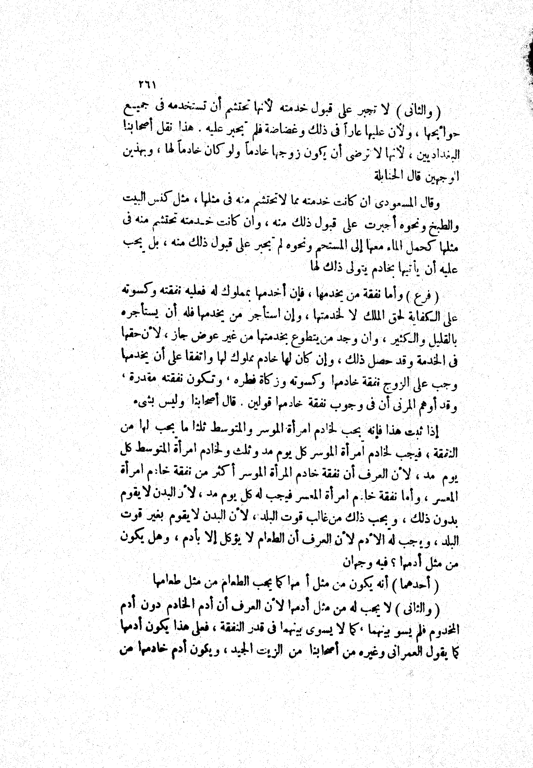 قال أصحابنا وليس بشئ إذا ثبت هذا فإنه يجب لخادم امرأة الموسر والمتوسط ثلثا ما يجب لها من النفقة، فيجب لخادم امرأة الموسر كل يوم مد وثلث لخادم امرأة المتوسط كل يوم مد، لان العرف أن نفقة خادم المرأة الموسر أكثر من نفقة خادم امرأة المعسر، وأما نفقة خادم امرأة المعسر فيجب له كل يوم مد، لان البدن لا يقوم بدون، ذلك ويجب ذلك من غالب قوت البلد، لان البدن لا يقوم بغير قوت البلد ويجب له الادم لان العرف أن الطعام لا يؤكل إلا بأدم، وهل يكون من مثل أدمها؟ فيه وجهان