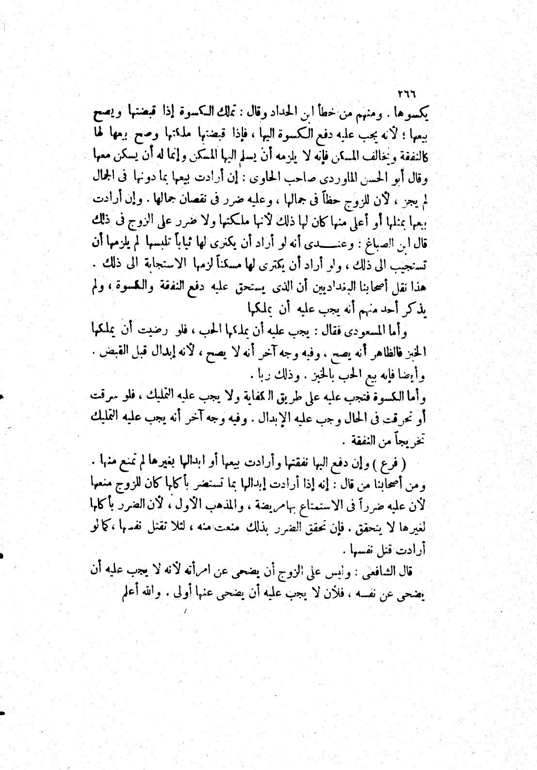 ومنهم من خطأ ابن الحداد وقال: تملك الكسوة إذا قبضتها ويصح بيعها، لانه يجب عليه دفع الكسوة إليها، فإذا قبضتها ملكتها وصح بيعها لها كالنفقة ويخالف المسكن فإنه لا يلزمه أن يسلم إليها المسكن وإنما له أن يسكن معها وقال أبو الحسن الماوردى صاحب الحاوى: إن أرادت بيعها بما دونها في الجمال لم يجز، لان للزوج حظأ في جمالها، وعليه ضرر في نقصان جمالها، وإن أرادت بيعها بمثلها أو أعلى منها كان لها ذلك لانها ملكتها ولا ضرر على الزوج في ذلك قال ابن الصباغ: وعندي أنه لو أراد أن يكترى لها ثيابا تلبسها لم يلزمها أن تستجيب إلى ذلك، ولو أراد أن يكترى لها مسكنا لزمها الاستجابة إلى ذلك.