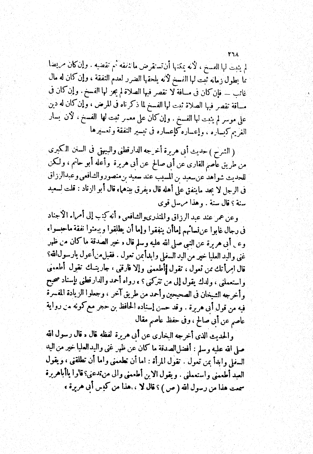 وهذا مرسل قوى وعن عمر بن عند عبد الرزاق والمنذري والشافعي " أنه كتب إلى أمراء الاجناد في رجال غابوا عن نسائهم إما أن ينفقوا وإما أن يطلقوا ويبعثوا نفقة ما حبسوا " وَعَنْ أَبِي هُرَيْرَةَ عَنْ النَّبِيِّ صَلَّى اللَّهُ عَلَيْهِ وَسَلَّمَ قَالَ " خير الصدقة ماكان من ظهر غنى واليد العليا خير من اليد السلفي وابدأ بمن تعول.