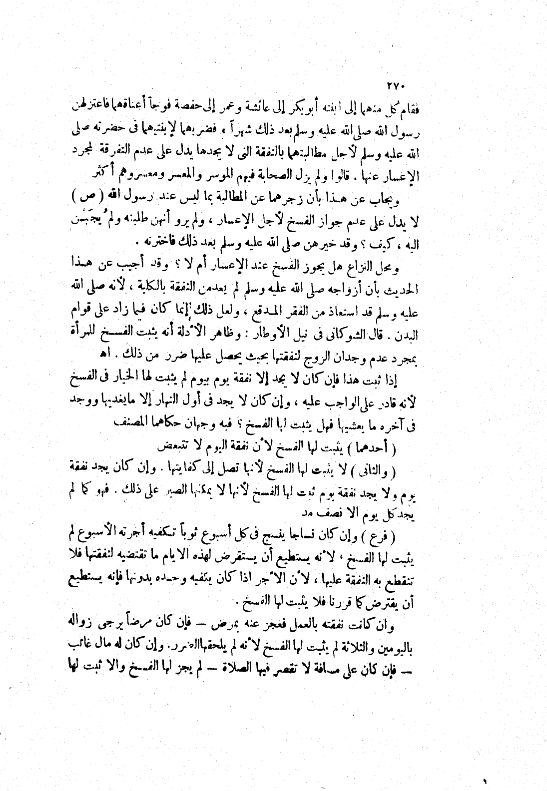 فقام كل منهما إلى ابنته أبو بكر إلى عائشة وعمر إلى حفصة فوجا أعناقهما فاعتزلهن رَسُولِ اللَّهِ صَلَّى اللَّهُ عَلَيْهِ وَسَلَّمَ بَعْدَ ذلك شهرا " فضربهما لابنتيهما في حضرته صلى الله عليه وسلم لاجل مطالبتهما بالنفقة التي لا يجدها يدل على عدم التفرقة لمجرد الاعسار عنها.