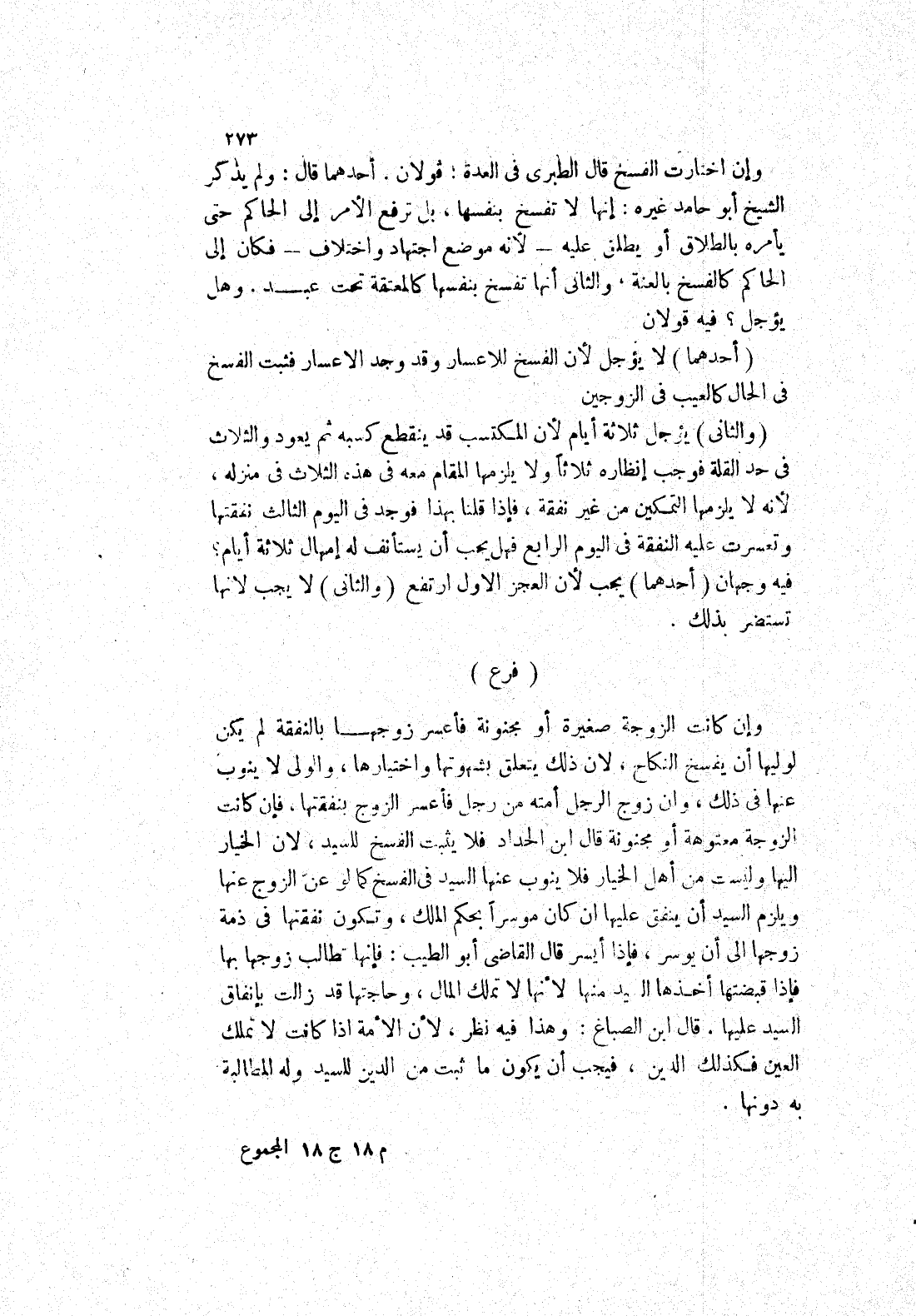 فإن كانت الزوجة معتوهة أو مجنونة قال ابن الحداد فلا يثبت الفسخ للسيد، لان الخيار إليها وليست من أهل الخيار فلا ينوب عنها السيد في الفسخ كما لو عن الزوج عنها ويلزم السيد أن ينفق عليها ان كان موسرا بحكم الملك، وتكون نفقتها في ذمة زوجها إلى أن يوسر، فإذا أيسر قال القاضى أبو الطيب: فإنها تطالب زوجها بها فإذا قبضتها أخذها السيد منها لانها لا تملك المال، وحاجتها قد زالت بإنفاق السيد عليها، قال ابن الصباغ: وهذا فيه نظر، لان الامة إذا كانت لا تملك العين فكذلك الدين، فيجب أن يكون ما ثبت من الدين للسيد وله المطالبة به دونها.