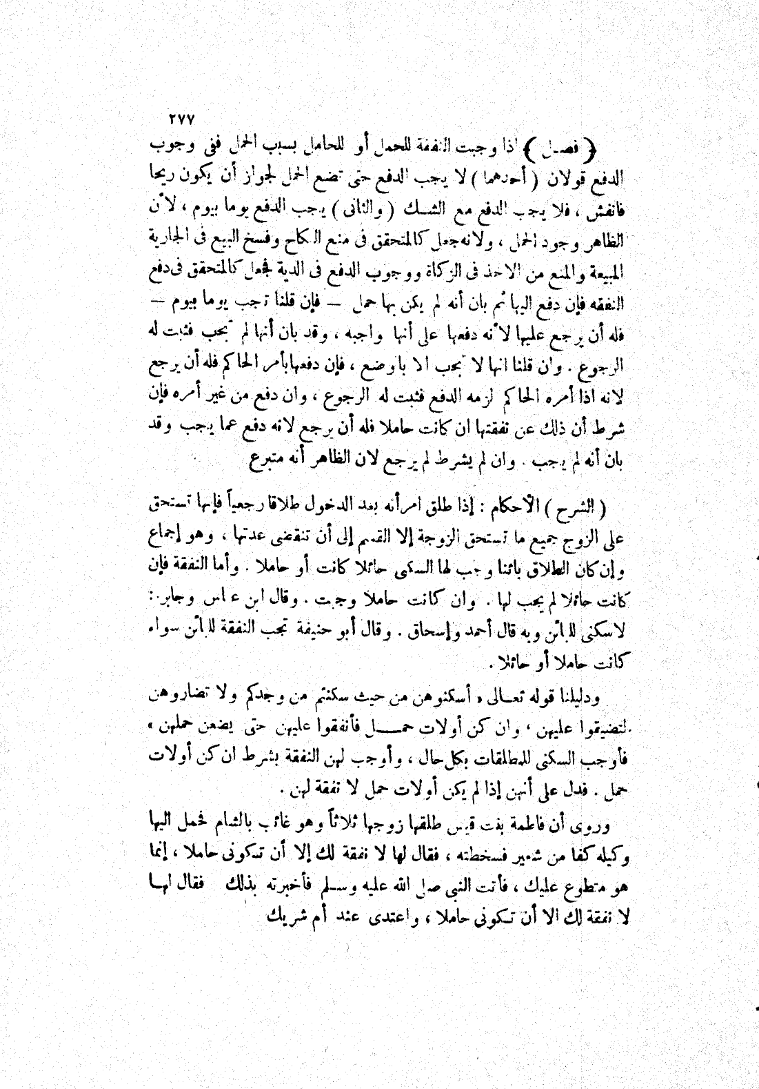 ودليلنا قوله تعالى " أسكنوهن من حيث سكنتم من وجدكم ولا تضاروهن لتضيقوا عليهن، وان كن أولات حمل فأنفقوا عليهن حتى يضعن حملهن، فأوجب السكنى للمطلقات بكل حال، وأوجب لهن النفقة بشرط ان كن أولات حمل.