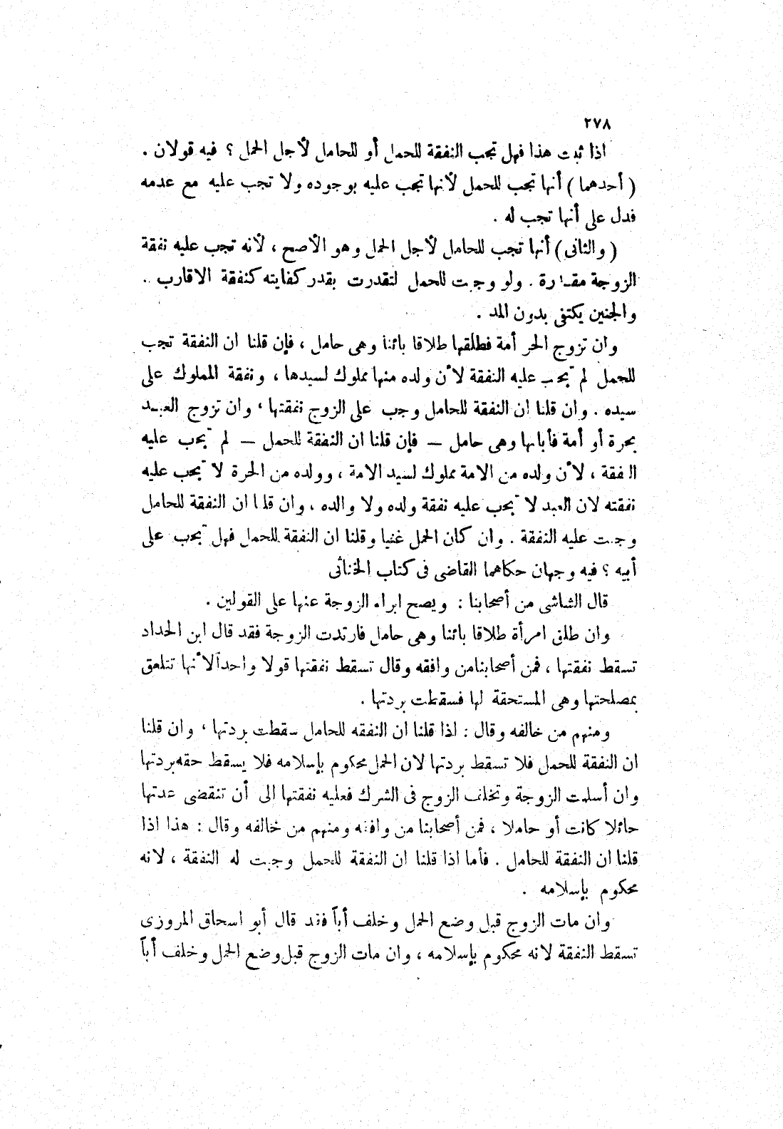 ومنهم من خالفه وقال: إذا قلنا ان النفقه للحامل سقطت بردتها، وان قلنا ان النفقه للحمل فلا تسقط بردتها لان الحمل محكوم بإسلامه فلا يسقط حقه بردتها وان أسلمت الزوجة وتخلف الزوج في الشرك فعليه نفقتها إلى أن تنقضي عدتها حائلا كانت أو حاملا، فمن أصحابنا من وافقه ومنهم من خالفه وقال: هذا إذا قلنا ان النفقة للحامل.