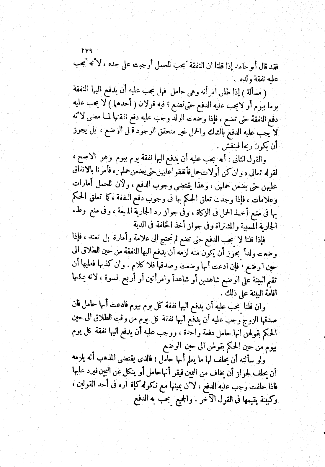 (مسألة) إذا طلق امرأته وهى حامل فهل يحب عليه أن يدفع إليها النفقة يوما بيوم أو لا يجب عليه الدفع حتى تضع؟ فيه قولان