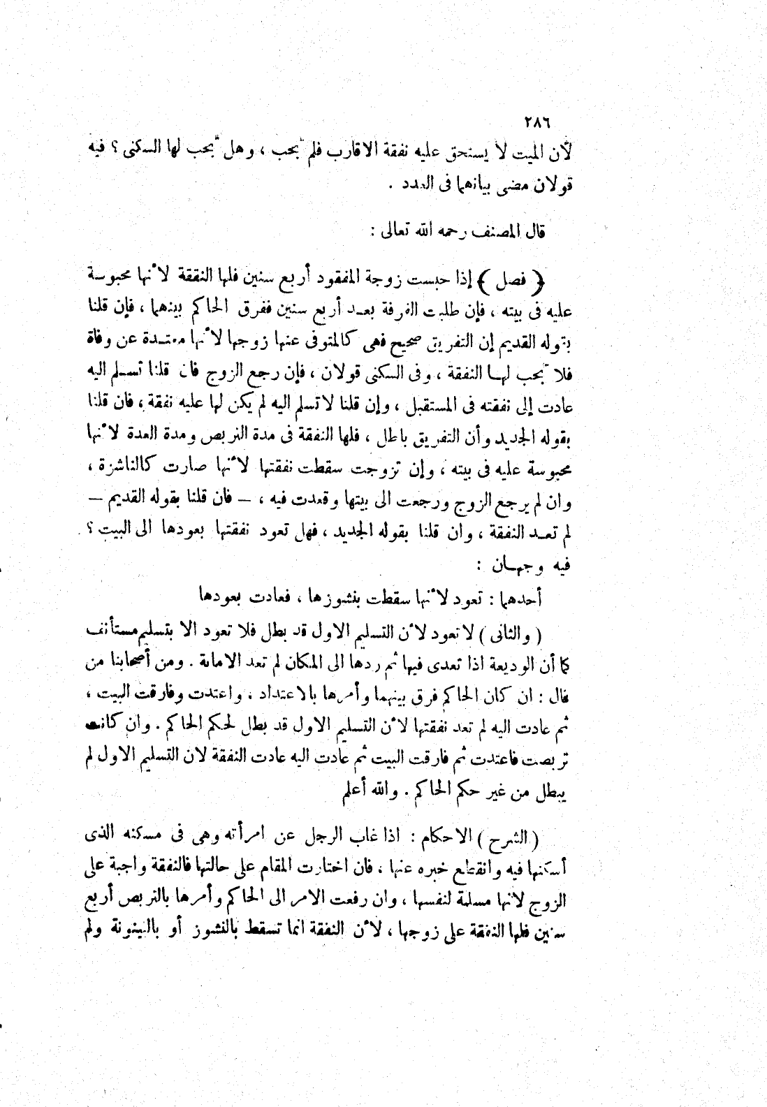 إذا حبست زوجة المفقود أربع سنين فلها النفقة لانها محبوسة عليه في بيته، فإن طلبت الفرقة بعد أربع سنين ففرق الحاكم بينهما، فإن قلنا بقوله القديم إن التفريق صحيح فهى كالمتوفى عنها زوجها لانها معتدة عن وفاة فلا تجب لها النفقة، وفي السكنى قولان، فإن رجع الزوج فان قلنا تسلم إليه عادت إلى نفقته في المستقبل، وإن قلنا لاتسلم إليه لم يكن لها عليه نفقة، فان قلنا بقوله الجديد وأن التفريق باطل، فلها النفقة في مدة التربص ومدة العدة لانها محبوسة عليه في بيته، وإن تزوجت سقطت نفقتها لانها صارت كالناشزة، وان لم يرجع الزوج ورجعت إلى بيتها وقعدت فيه، - فان قلنا بقوله القديم - لم تعد النفقة، وان قلنا بقوله الجديد، فهل تعود نفقتها بعودها إلى البيت؟ فيه وجهان: أحدهما: تعود لانها سقطت بنشوزها، فعادت بعودها