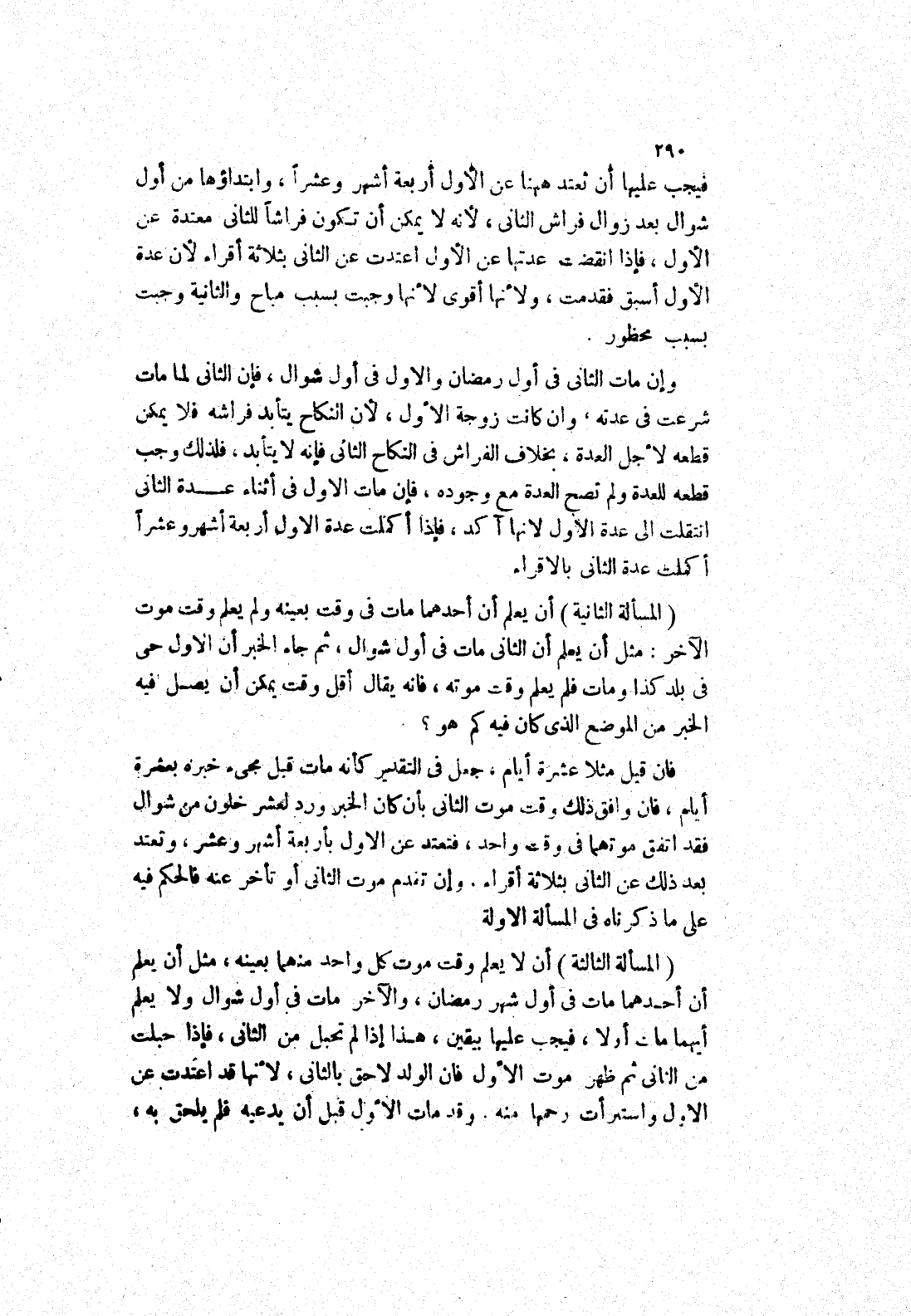 وإن مات الثاني في أول رمضان والاول في أول شوال، فإن الثاني لما مات شرعت في عدته، وان كانت زوجة الاول، لان النكاح يتأبد فراشه فلا يمكن قطعه لاجل العدة، بخلاف الفراش في النكاح الثاني فإنه لا يتأبد، فلذلك وجب قطعه للعدة ولم تصبح العدة مع وجوده فإن مات الاول في أثناء عدة الثاني انتقلت إلى عدة الاول لانها آكد، فإذا أكملت عدة الاول أربعة أشهر وعشرا أكملت عدة الثاني بالاقراء (المسألة الثانية) أن يعلم أن أحدهما مات في وقت بعينه ولم يعلم وقت موت الآخر: مثل أن يعلم أن الثاني مات في أول شوال، ثم جاء الخبر أن الاول حى في بلد كذا ومات فلم يعلم وقت موته، فانه يقال أقل وقت يمكن أن يصل فيه الخبر من الموضع الذي كان فيه كم هو؟ فان قيل مثلا عشرة أيام، جعل في التقدير كأنه مات قبل مجئ خبره بعشرة أيام، فان وافق ذلك وقت موت الثاني بأن كان الخبر ورد لعشر خلون من شوال فقد اتفق موتهما في وقت واحد، فتعتد عن الاول بأربعة أشهر وعشر، وتعتد بعد ذلك عن الثاني بثلاثة أقراء، وإن تقدم موت الثاني أو تأخر عنه فالحكم فيه على ما ذكرناه في المسألة الاولة (المسألة الثالثة) أن لا يعلم وقت موت كل واحد منهما بعينه، مثل أن يعلم أن أحدهما مات في أول شهر رمضان، والآخر مات في أول شوال ولا يعلم أيهما مات أولا، فيجب عليها بيقين، هذا إذا لم تحبل من الثاني، فإذا حبلت