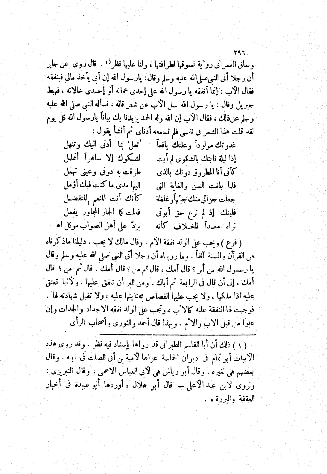 قال روى عن جابر أَنَّ رَجُلًا أَتَى النَّبِيَّ صَلَّى اللَّهُ عَلَيْهِ وسلم وقال: يارسول الله إن أبى يأخذ مالى فينفقه فقال الاب: إنما أنفقه يارسول الله على إحدى عمله أو إحدى خالاته، فهبط جبريل وقال: يارسول الله سل الاب عن شعر قاله، فسأله النَّبِيَّ صَلَّى اللَّهُ عَلَيْهِ وَسَلَّمَ عَنْ ذَلِكَ، فقال الاب إن الله وله الحمد يزيدنا بك بيانا يارسول الله كل يوم لقد قلت هذا الشعر في نفسي فلم تسمعه أذناى ثم أنشأ يقول: غدوتك مولودا وعلتك يافعا تعل بما أدنى اليك وتنهل إذا ليلة نابتك بالشكوى لم أبت لشكوك إلا ساهرا أتملل كأنى أن المطروق دونك بالذي طرقت به دوني وعينى تهمل فلما بلغت السن والغاية التي إليها مدى ماكنت فيك أؤمل جعلت جزائي منك جبها وغلظة كأنك أنت المنعم المتفضل فليتك إذ لم ترع حق أبوتى فعلت كما الجار المجاور يفعل تراه معدا للخلاف كأنه يرد على أهل الصواب موكل اه (فرع)