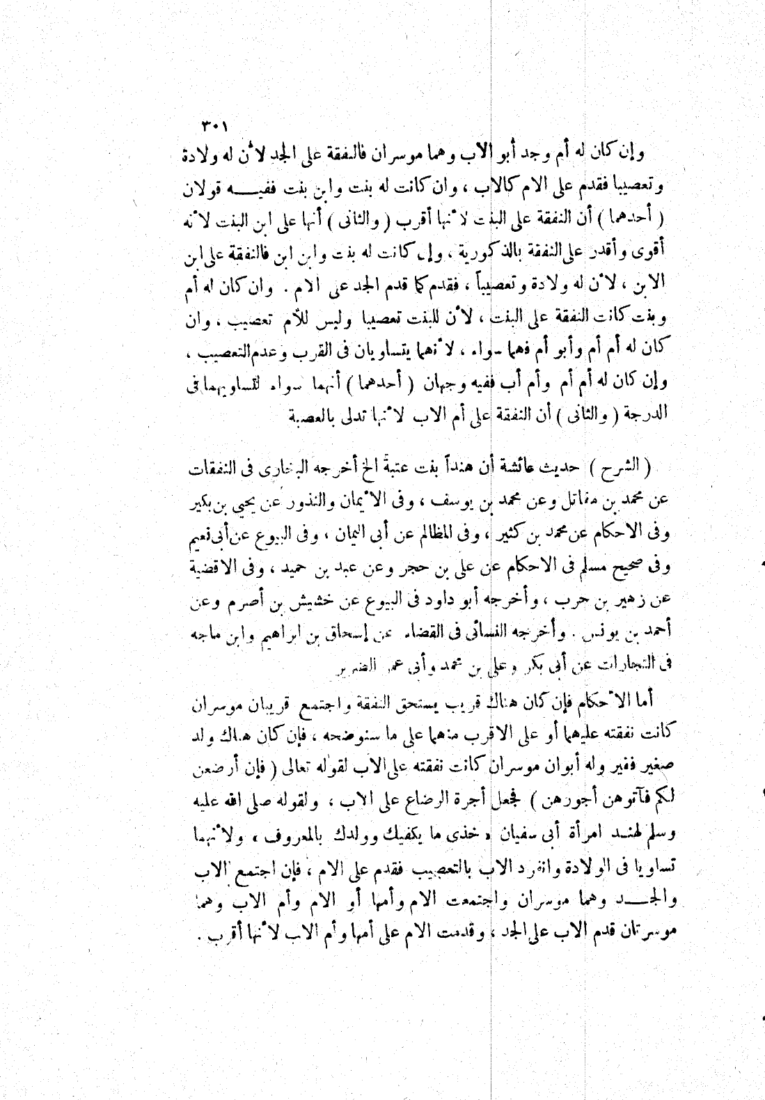 وأخرجه النسائي في القضاء عن إسحاق بن ابراهيم وابن ماجه في التجارات عن أبى بكر وعلى بن محمد وأبى عمر الضرير أما الاحكام فإن كان هناك قريب يستحق النفقة واجتمع قريبان موسران كانت نفقته عليهما أو على الاقرب منهما على ما سنوضحه، فإن كان هناك ولد صغير فقير وله أبوان موسران كانت نفقته على الاب لقوله تعالى (فإن أرضعن لكم فآتوهن أجورهن) فجعل أجرة الرضاع على الاب، ولقوله صلى الله عليه وسلم لهند امرأة أبى سفيان " خذي ما يكفيك وولدك بالمعروف " ولانهما تساويا في الولادة وانفرد الاب بالتعصيب فقدم على الام، فإن اجتمع الاب والجد وهما موسران واجمتعت الام وأمها أو الام وأم الاب وهما