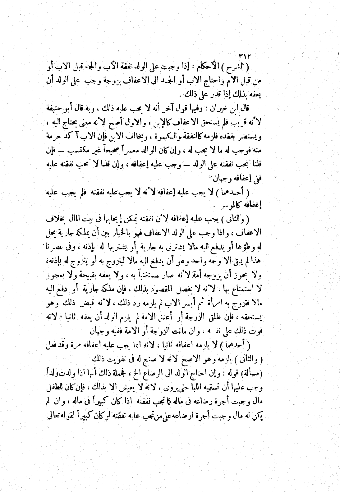 (الشرح) الاحكام: إذا وجبت على الولد نفقة الاب والجد قبل الاب أو من قبل الام واحتاج الاب أو الجد إلى الاعفاف بزوجة وجب على الولد أن يعفقه بذلك إذا قدر على ذلك.