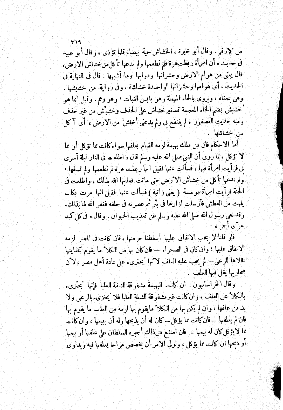 أما الاحكام فان من ملك بهيمة لزمه القيام بعلفها سواء كانت مما تؤكل أو مما لا تؤكل، لِمَا رُوِيَ أَنَّ النَّبِيَّ صَلَّى اللَّهُ عَلَيْهِ وَسَلَّمَ قَالَ " اطلعت في النار ليلة أسرى
