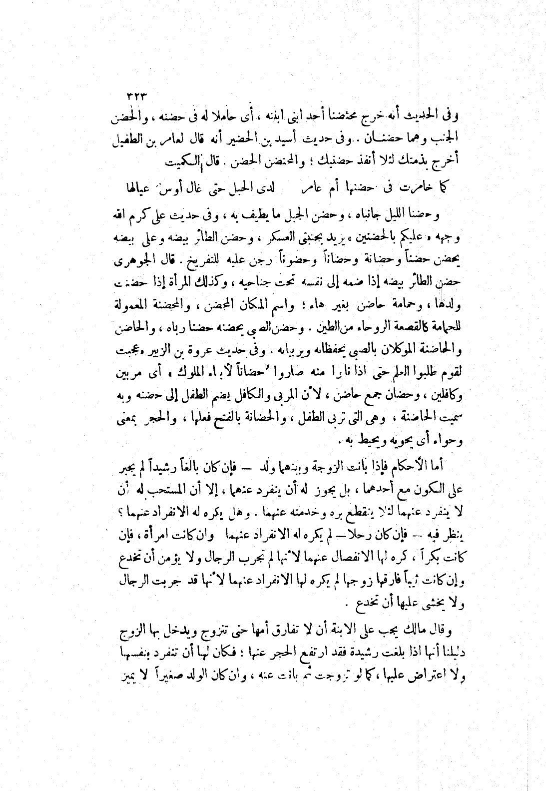 وفي حديث عروة بن الزبير " عجبت لقوم طلبوا العلم حتى إذا ناوا منه صاروا حضانا لاباء الملوك " أي مربين وكافلين، وحضان جمع حضان، لان المربى والكافل يضم الطفل إلى حضنه وبه سميت الحاضنة، وهى التي تربى الطفل، والحاضنة بالفتح فعلها، والحجر بمعنى وحواء أي يحويه ويحيط به.