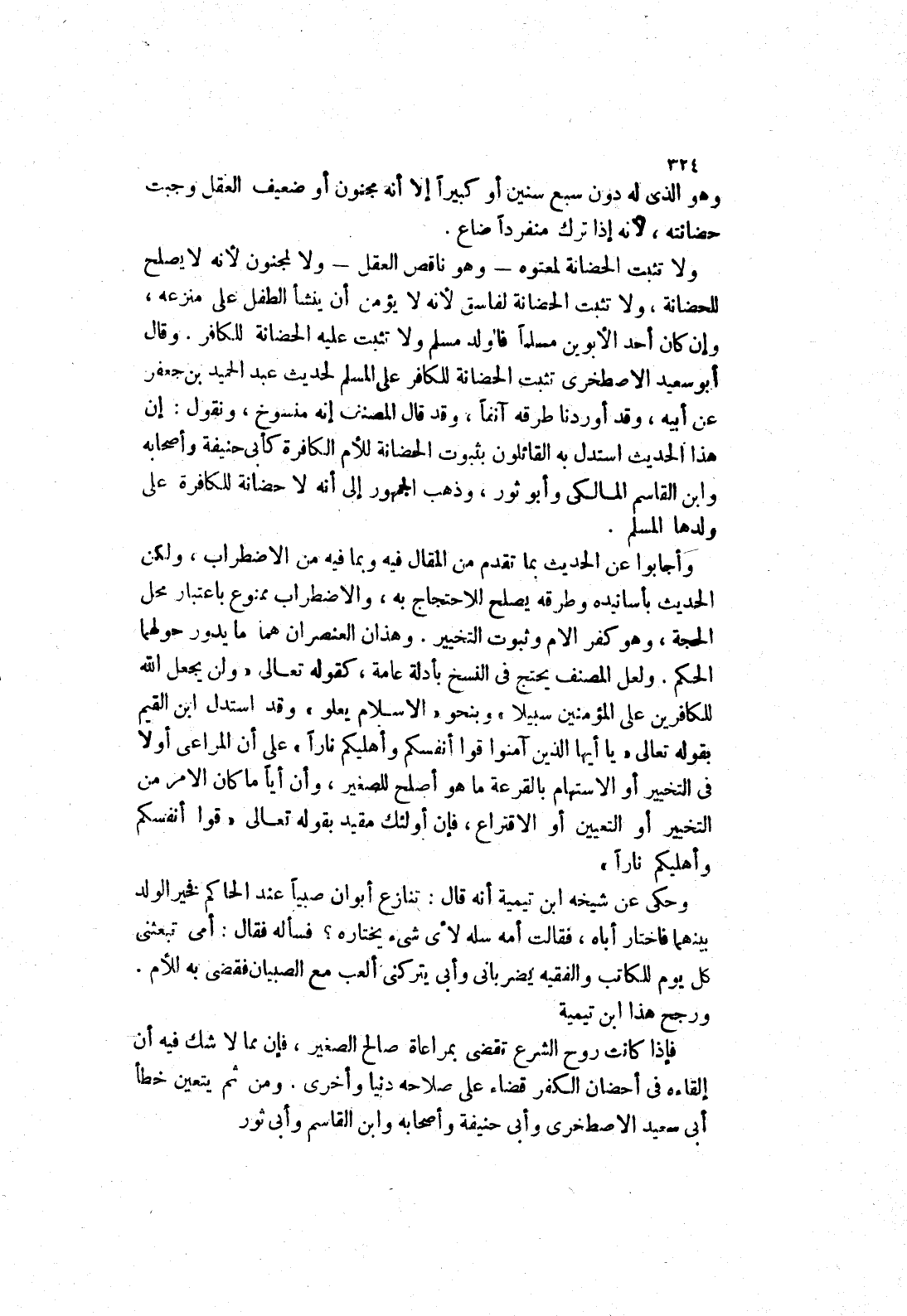 ولعل المصنف يحتج في النسخ بأدلة عامة، كقوله تَعَالَى " وَلَنْ يَجْعَلَ اللَّهُ لِلْكَافِرِينَ عَلَى الْمُؤْمِنِينَ سبيلا " وبنحو " الاسلام يعلو " وقد استدل ابن القيم بقوله تعالى " يَا أَيُّهَا الَّذِينَ آمَنُوا قُوا أَنْفُسَكُمْ وَأَهْلِيكُمْ نارا " على أن المراعى أولا في التخيير أو الاستهام بالقرعة ما هو أصلح للصغير، وأن أيا ما كان الامر من التخيير أو التعيين أو الاقتراع، فإن أولئك مقيد بقوله تعالى " قوا أنفسكم وأهليكم نارا " وحكى عن شيخه ابن تيمية أنه قال: تنازع أبوان صبيا عند الحاكم فخير الولد بينهما فاختار أباه، فقالت أمه سله لاى شئ يختاره؟ فسأله فقال: أمي تبعثني كل يوم للكاتب والفقيه يضرباني وأبى يتركني ألعب مع الصبيان فقضى به للام.