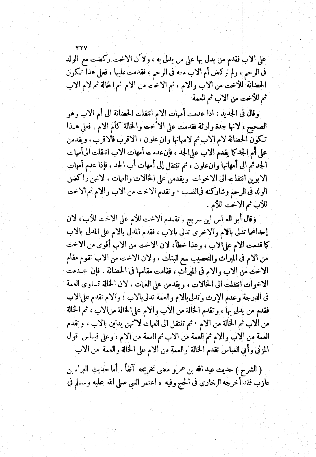 من الاب ثم الخالة من الام، ثم تنتقل إلى العمات لانهن يدلين بالاب، وتقدم العمة من الاب والام ثم العمة من الاب ثم العمة من الام، وعلى قياس قول المزني وأبى العباس تقدم الخالة والعمة من الام على الخالة والعمة من الاب (الشرح) حديث عبد الله بن عمرو مضى تخريجه آنفا.