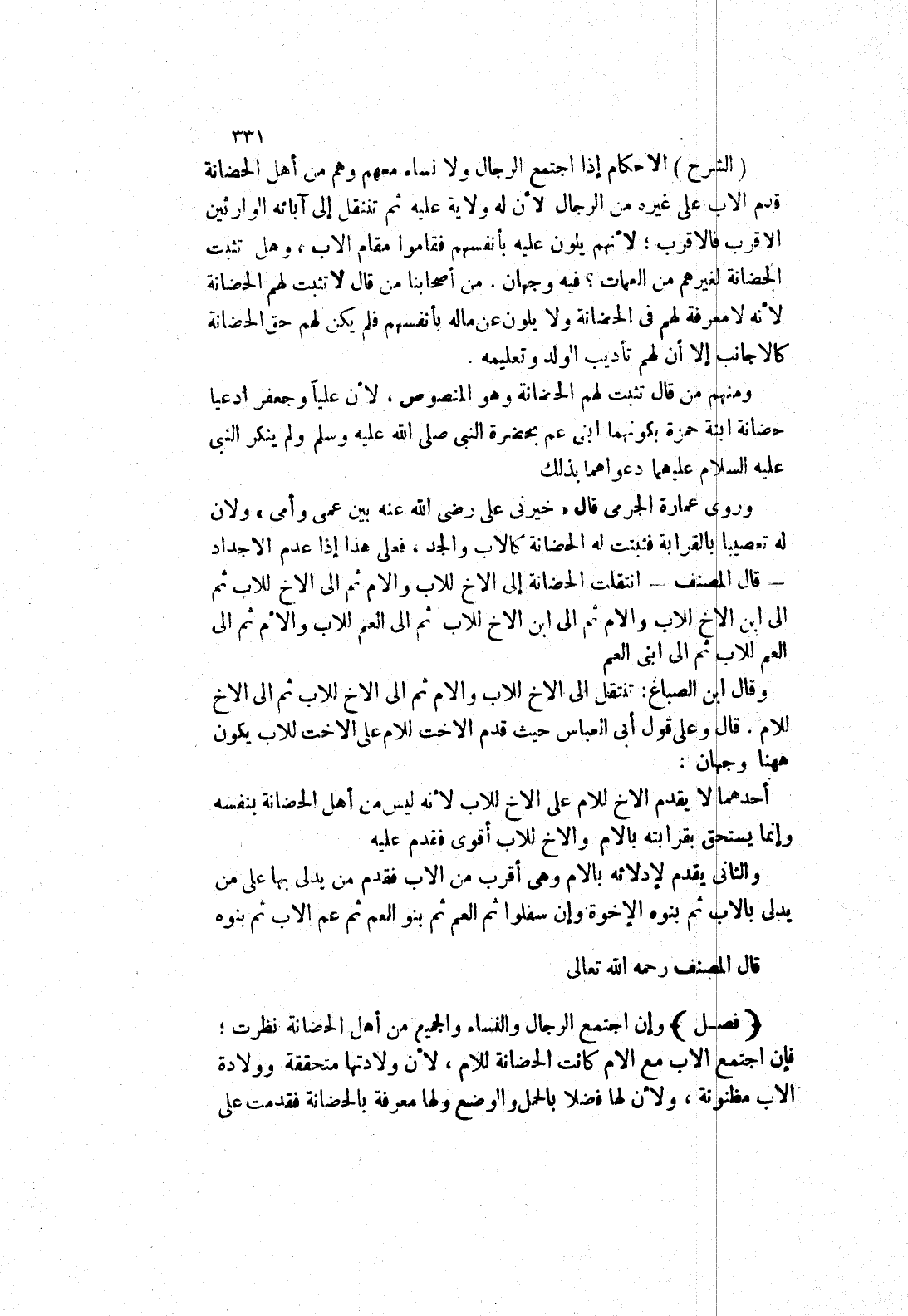 (الشرح) الاحكام إذا اجتمع الرجال ولانساء معهم وهم من أهل الحضانة قدم الاب على غيره من الرجال لان له ولاية عليه ثم تنتقل إلى آبائه الوارثين