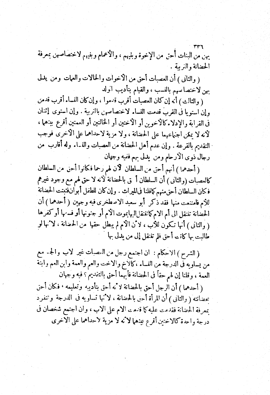 أن العصبات أحق من الاخوات والخالات والعمات ومن يدلى بهن لاخصتاصهم بالنسب، والقيام بتأديب الولد (والثالث) أنه إن كان العصبات أقرب قدموا، وإن كان النساء أقرب قدمن وإن استويا في القرب قدمت النساء لاختصاصهن بالتربية.
