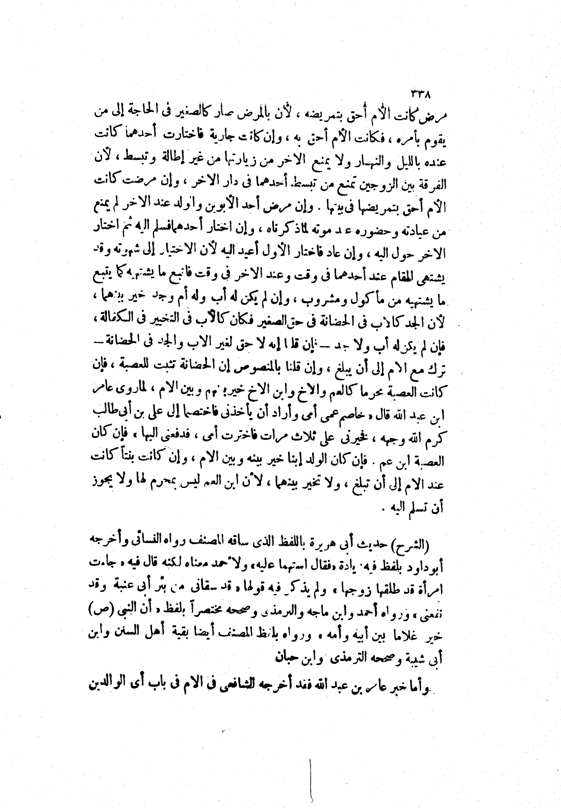 (الشرح) حديث أبى هريرة باللفظ الذي ساقه المصنف رواه النسائي وأخرجه أبو داود بلفظ فيه زياده فقال استهما عليه " ولاحمد معناه لكنها قال فيه " جاءت امرأة قد طلقها زوجها " ولم يذكر فيه قولها " قد سقاني من بئر أبى عنبة وقد نفعني " ورواه أحمد وأبن ماجه والترمذي وصححه مختصرا بلفظ " أَنَّ النَّبِيَّ صَلَّى اللَّهُ عَلَيْهِ وَسَلَّمَ خَيَّرَ غلاما بين أبيه وأمه، ورواه بلفظ المصنف أيضا بقية أهل السنن وابن أبى شيبة وصححه الترمذي وابن حبان وأما خبر عامر بن عبد الله فقد أخرجه الشافعي في الام في باب أي الوالدين