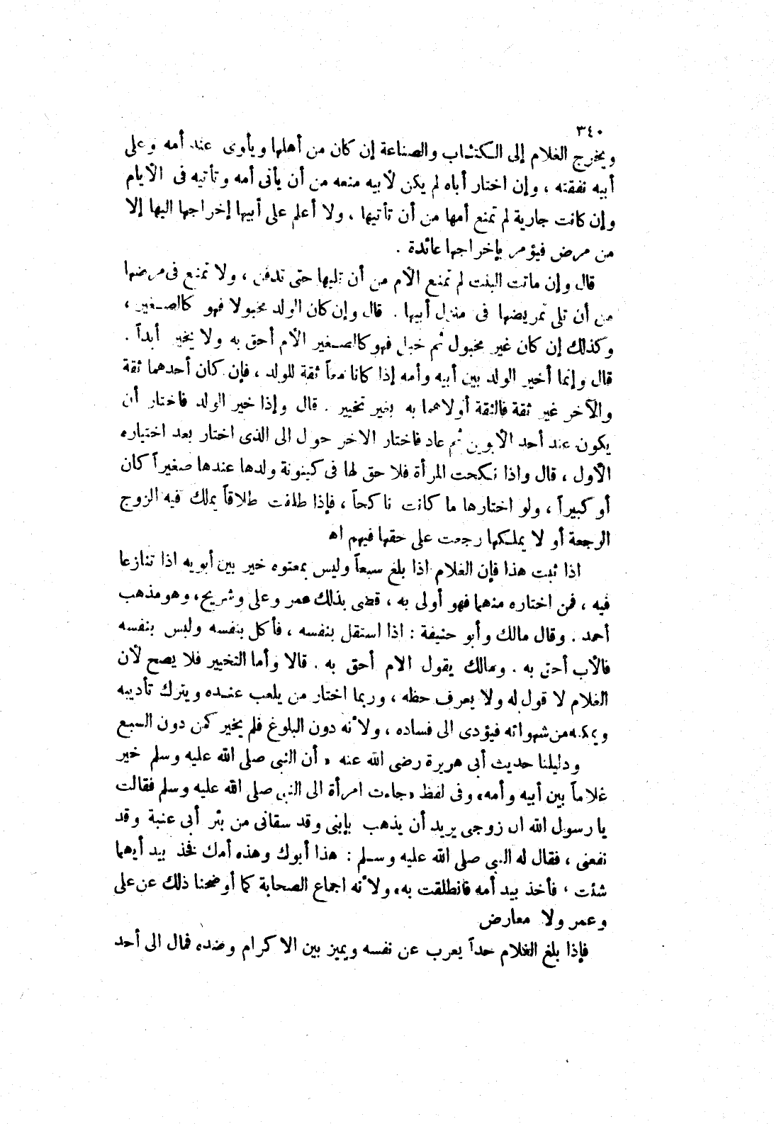 قال وإذا خبر الولد فاختار أن يكون عند أحد الابوين ثم عاد فاختار الاخر حول إلى الذي اختار بعد اختياره الاول، قال وإذا نكحت المرأة فلا حق لها في كينونة ولدها عندها صغيرا كان أو كبيرا، ولو اختارها ما كانت ناكحا، فإذا طلقت طلاقا يملك فيه الزوج الرجعة أو لا يملكها رجعت على حقها فيهم اه إذا ثبت هذا فإن الغلام إذا بلغ سبعا وليس بمعتوه خير بين أبويه إذا تنازعا فيه، فمن اختاره منهما فهو أولى به، قضى بذلك عمر وعلى شريح، وهو مذهب أحمد، وقال مالك وابو حنيفة: إذا استقل بنفسه، فأكل بنفسه ولبس بنفسه فالاب أحق به.