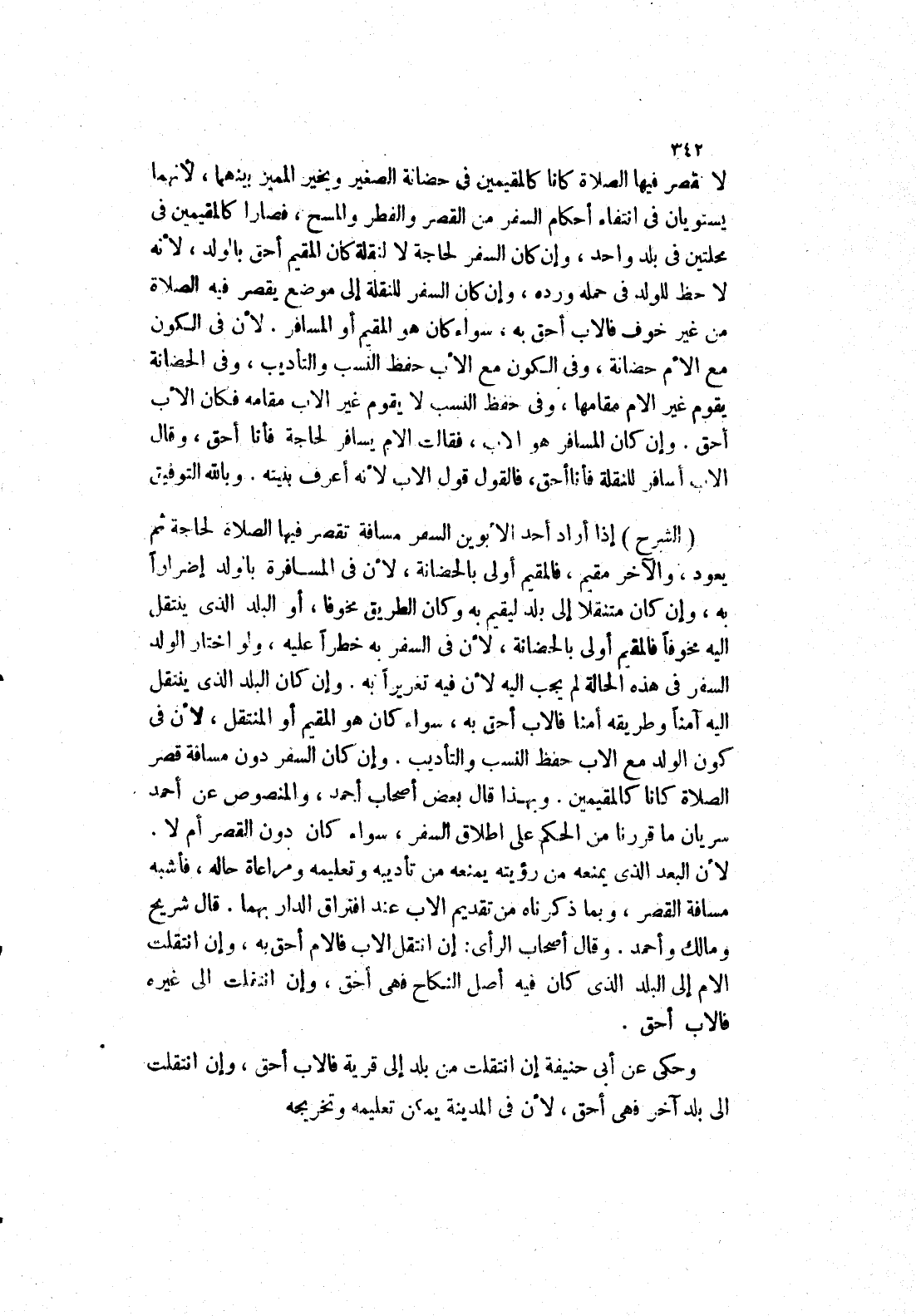 لا تقصر فيها الصلاة كانا كالمقيمين في حضانة الصغير ويخير المميز بينهما، لانهما يستويان في انتفاء أحكام السفر من القصر والفطر والمسح، فصارا كالمقيمين في محلتين في بلد واحد، وإن كان السفر لحاجة لا لنقلة كان المقيم أحق بالولد، لانه لاحظ للولد في حمله ورده، وإن كان السفر للنقلة إلى موضع يقصر فيه الصلاة من غير خوف فالاب أحق به، سواء كان هو المقيم أو المسافر.