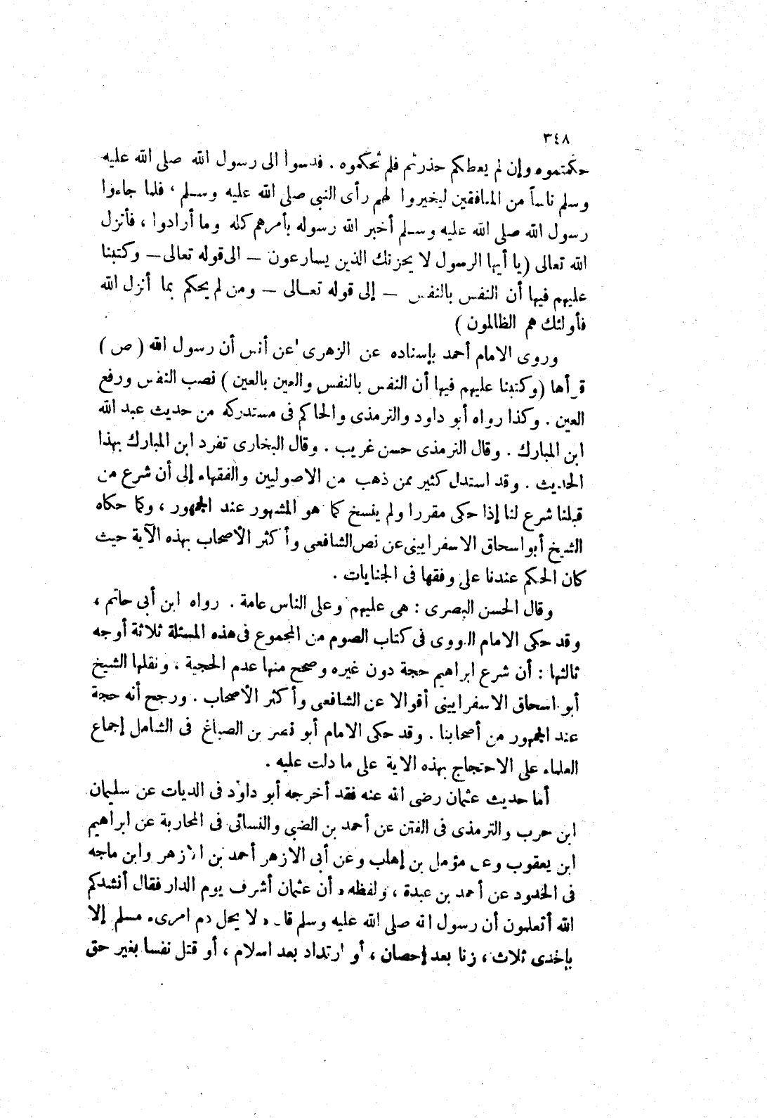 ابن حرب والترمذي في الفتن عن أحمد بن الضبى والنسائي في المحاربة عن ابراهيم ابن يعقوب وعن مؤمل بن إهاب وعن أبى الازهر أحمد بن الازهر وابن ماجه في الحدود عن أحمد بن عبدة، ولفظه " أن عثمان أشرف يوم الدار فقال أنشدكم الله أَتَعْلَمُونَ أَنَّ رَسُولَ اللَّهِ صَلَّى اللَّهُ عَلَيْهِ وَسَلَّمَ قَالَ " لَا يَحِلُّ دَمُ امْرِئٍ مُسْلِمٍ إلَّا بإحدى ثلاث، زنا بعد إحصان، أو ارتداد بعد اسلام، أو قتل نفسا بغير حق