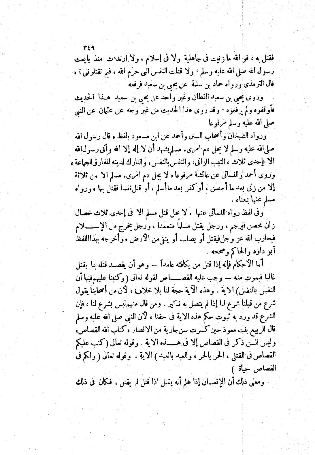 فيم تقتلوني؟ " قال الترمذي ورواه حماد بن سلمة عن يحيى بن سعيد فرفعه وروى يحيى بن سعيد القطان وغير واحد عن يحيى بن سعيد هذا الحديث فأوقفوه ولم يرفعوه، وَقَدْ رُوِيَ هَذَا الْحَدِيثُ مِنْ غَيْرِ وَجْهٍ عَنْ عُثْمَانَ عَنْ النَّبِيِّ صَلَّى اللَّهُ عَلَيْهِ وَسَلَّمَ مرفوعا ورواه الشيخان وأصحاب السنن وأحمد عن ابن مسعود بلفظ " قَالَ رَسُولُ اللَّهِ صَلَّى اللَّهُ عَلَيْهِ وَسَلَّمَ لَا يحل دم امرئ مسلم يشهد أَنْ لَا إلَهَ إلَّا اللَّهُ وَأَنِّي رَسُولُ الله الا بإحدى ثلاث، الثيب الزانى، والنفس بالنفس، والتارك لدينه المفارق للجماعة " وروى أحمد والنسائي عن عائشة مرفوعا " لا يحل دم امرئ مسلم الا من ثلاثة إلا من زنى بعد ما أحصن، أو كفر بعد ما أسلم، أو قتل نفسا فقتل بها " ورواه مسلم عنهما بمعناه.
