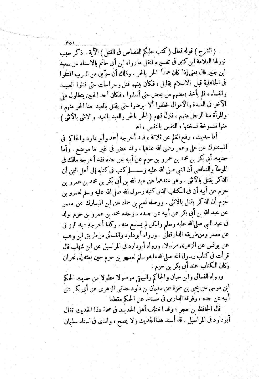 وأما حديث أَبِي بَكْرِ بْنُ مُحَمَّدِ بْنِ عَمْرِو بْنِ حَزْمٍ عن أبيه عن جده فقد أخرجه مالك في الموطأ والشافعي أن النبي صلى الله عليه وسلم كتب في كتابه إلى أهل اليمن أن الذكر يقتل بالانثى.