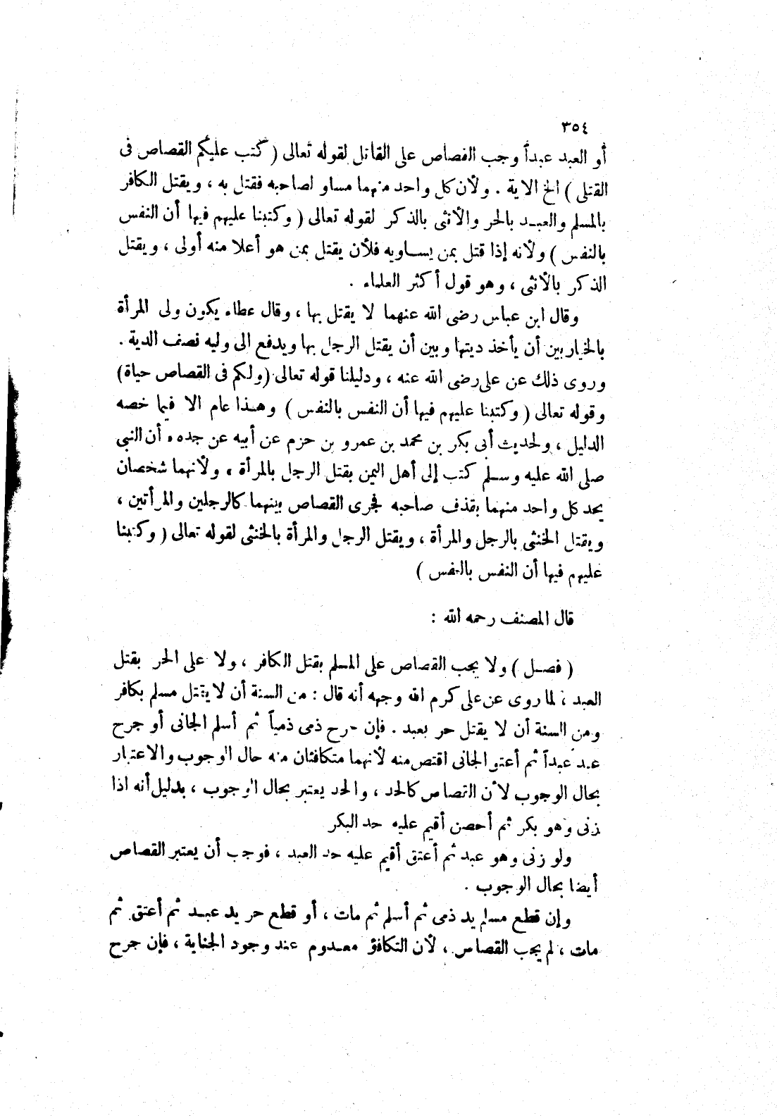 ولا يجب القصاص على المسلم بقتل الكافر، ولا على الحر بقتل العبد، لِمَا رُوِيَ عَنْ عَلِيٍّ كَرَّمَ اللَّهُ وَجْهَهُ أنه قال: من السنة أن لا يقتل مسلم بكافر ومن السنة أن لا يقتل حر بعبد.