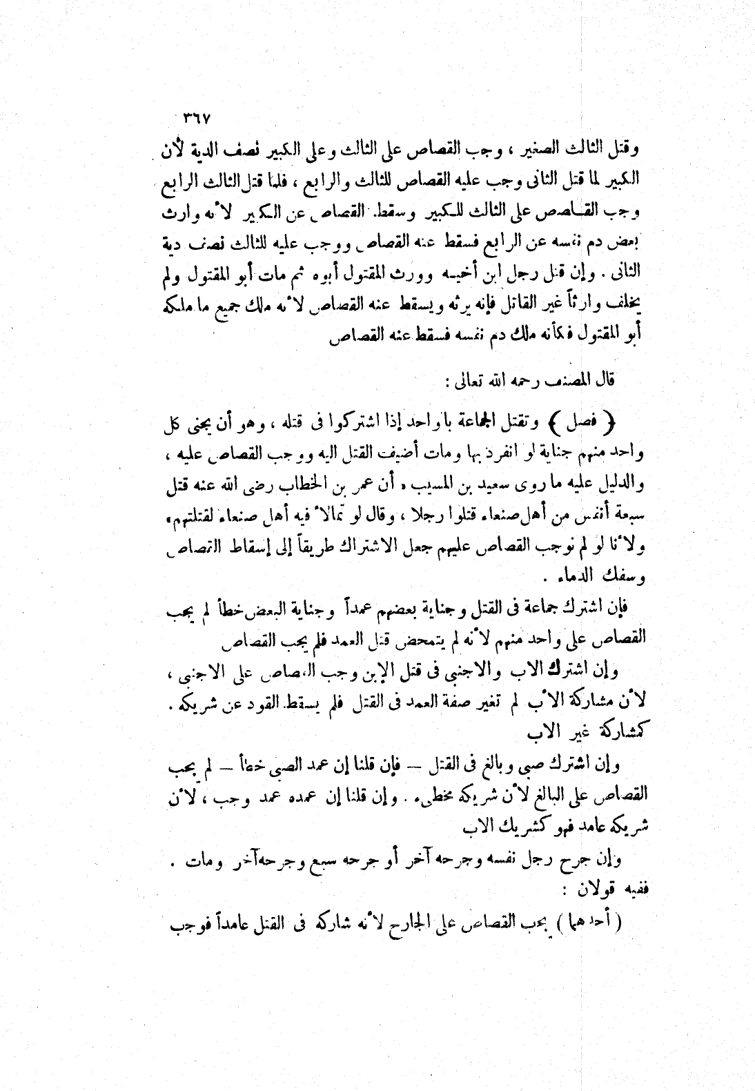 وتقتل الجماعة باواحد إذا اشتركوا في قتله، وهو أن يجنى كل واحد منهم جناية لو انفرد بها ومات أضيف القتل إليه ووجب القصاص عليه، والدليل عليه ماروى سعيد بن المسيب " أَنَّ عُمَرَ بْنَ الْخَطَّابِ رَضِيَ اللَّهُ عَنْهُ قتل سبعة أنفس من أهل صنعاء قتلوا رجلا، وقال لو تمالا فيه أهل صنعاء لقتلتهم " ولانا لو لم نوجب القصاص عليهم جعل الاشتراك طريقا إلى إسقاط القصاص وسفك الدماء.