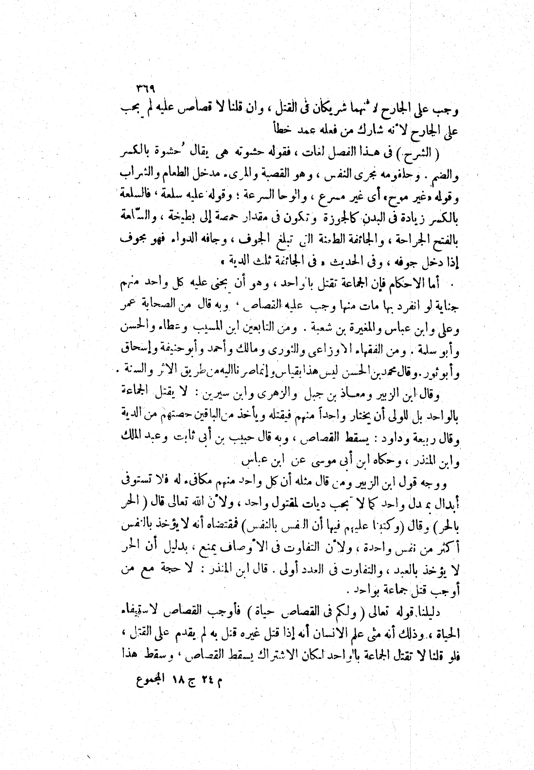 وحلقومه مجرى النفس، وهو القصبة والمرئ مدخل الطعام والشراب وقوله " غير موح " أي غير مسرع، والوحا السرعة ; وقوله عليه سلعة، فالسلعة بالكسر زيادة في البدن كالجوزة وتكون في مقدار حمصة إلى بطيخة، والسلعة بالفتح الجراحة، والجائفة الطعنة التي تبلغ الجوف، وجافه الدواء فهو مجوف إذا دخل جوفه، وفي الحديث في الجائفة ثلث الدية " أما الاحكام فإن الجماعة تقتل باواحد، وهو أن يجنى عليه كل واحد منهم جناية لو انفرد بها مات منها وجب عليه القصاص، وبه قال من الصحابة عمر وعلى وابن عباس والمغيرة بن شعبة.