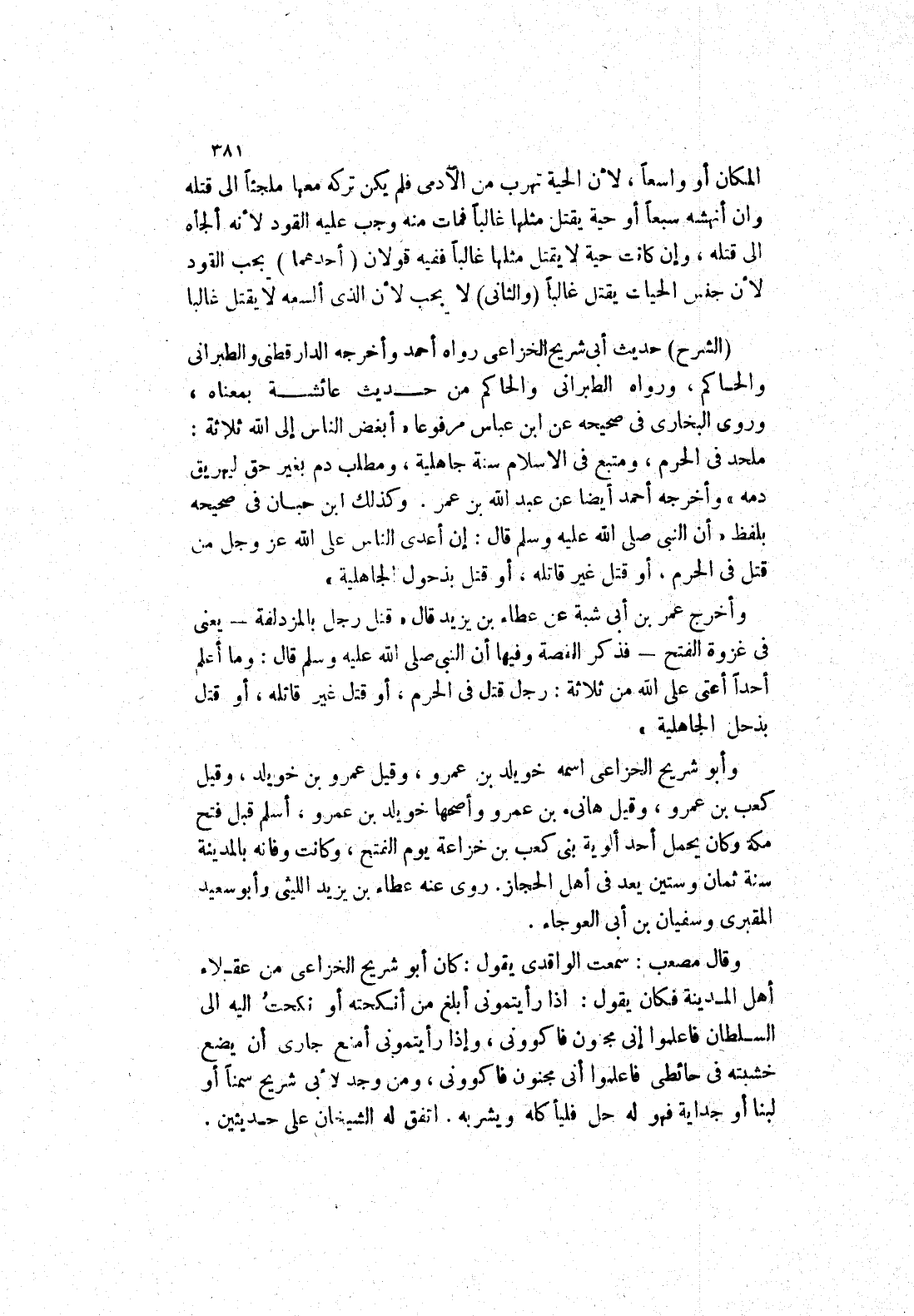 وكذلك ابن حبان في صحيحه بلفظ " إنَّ النَّبِيَّ صَلَّى اللَّهُ عَلَيْهِ وَسَلَّمَ قَالَ: إن أعدى الناس على الله عز وجل من قتل في الحرم، أو قتل غير قاتله، أو قتل بذحول الجاهلية " وأخرج عمر بن أبى شبة عن عطاء بن يزيد قال " قتل رجل بالمزدلفة - يعنى في غزوة الفتح - فذكر القصة وفيها إنَّ النَّبِيَّ صَلَّى اللَّهُ عَلَيْهِ وَسَلَّمَ قَالَ: وما أعلم أحدا أعتى على الله من ثلاثة: رجل قتل في الحرم، أو قتل غير قاتله، أو قتل بذحل الجاهلية " وأبو شريح الخزاعى اسمه خويلد بن عمرو، وقيل عمرو بن خويلد، وقيل كعب بن عمرو، وقيل هانئ بن عمرو وأصحها خويلد بن عمرو، أسلم قبل فتح مكة وكان يحمل أحد ألوية بنى كعب بن خزاعة يوم الفتح، وكانت وفاته بالمدينة سنة ثمان وستين يعد في أهل الحجاز.