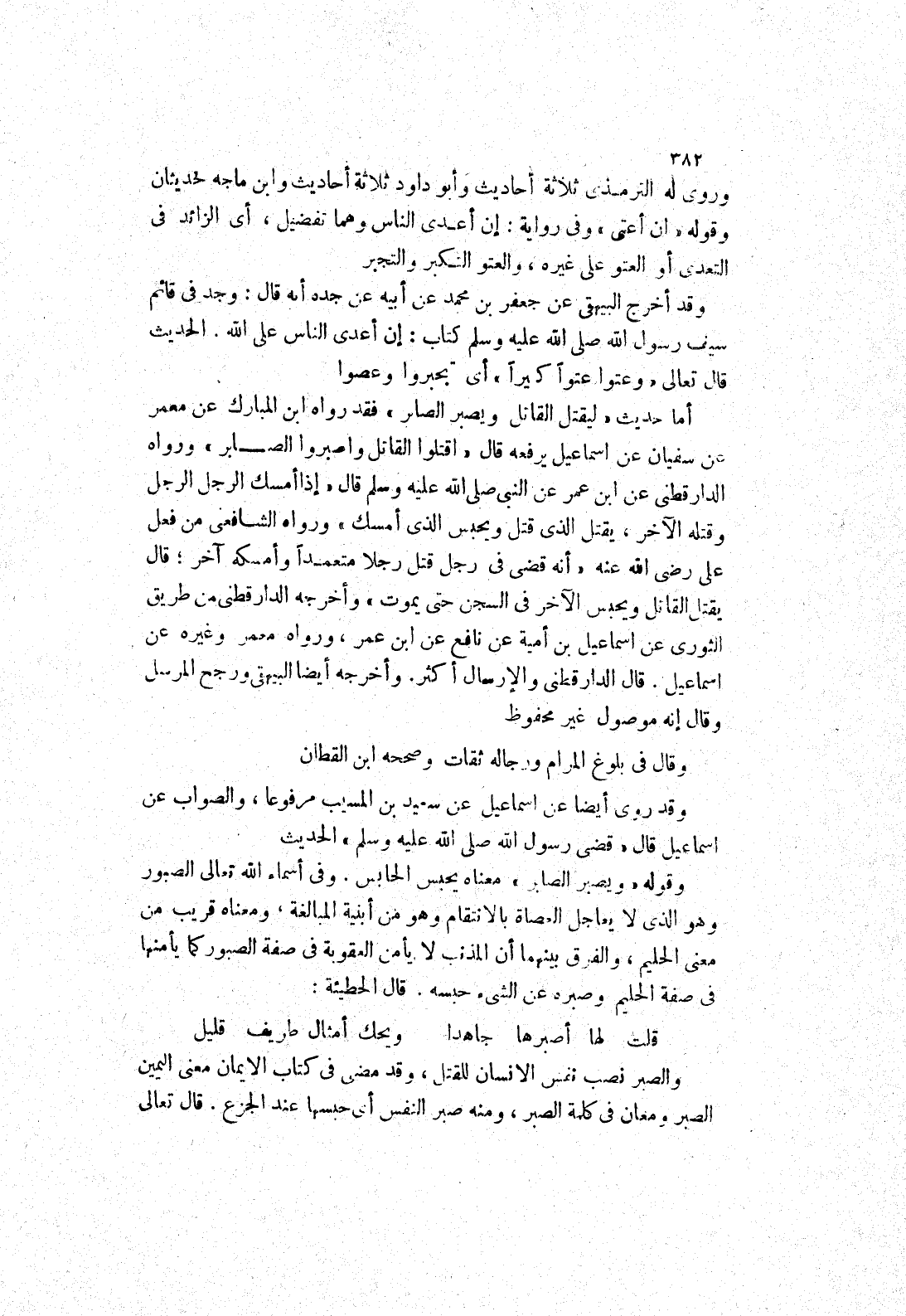 الحديث قال تعالى " وعتوا عتوا كبيرا " أي تجبروا وعصوا أما حديث " ليقتل القاتل ويصير الصابر " فقد رواه ابن المبارك عن معمر عن سفيان عن اسماعيل يرفعه قال " اقتلوا القاتل واصبروا الصابر " ورواه الدارقطني عَنْ ابْنِ عُمَرَ عَنْ النَّبِيِّ صَلَّى اللَّهُ عَلَيْهِ وَسَلَّمَ قَالَ " إذا أمسك الرجل الرجل وقتله الآخر، يقتل الذي قتل ويحبس الذي أمسك " ورواه الشافعي من فعل علي رضى الله عنه " أنه قضى في رجل قتل رجلا متعمدا وأمسكه آخر: قال يقتل القاتل ويحبس الآخر في السجن حتى يموت " وأخرجه الدارقطني من طريق الثوري عن اسماعيل بن أمية عن نافع عن ابن عمر، ورواه معمر وغيره عن اسماعيل.
