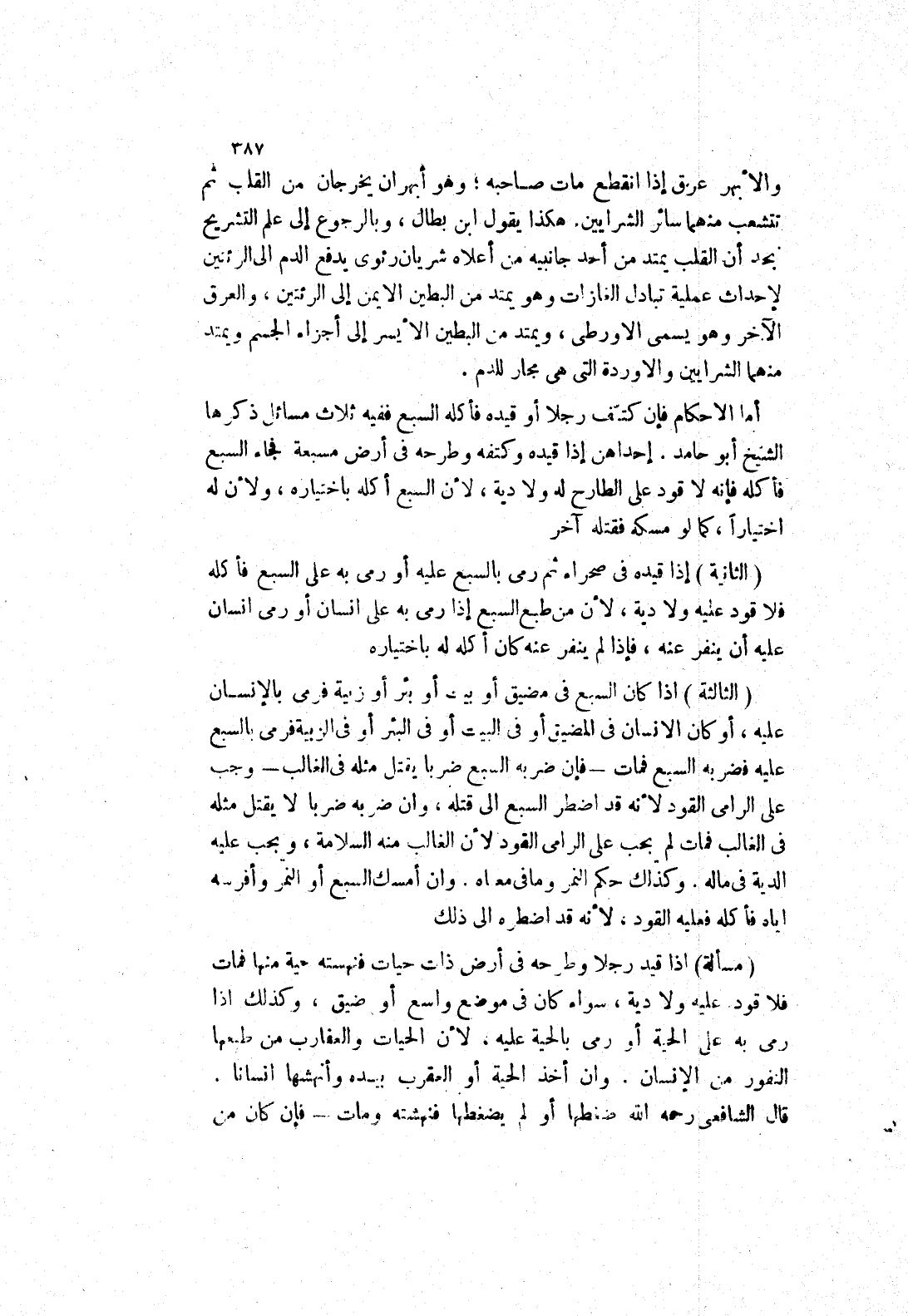 أما الاحكام فإن كتف رجلا أو قيده فأكله السبع ففيه ثلاث مسائل ذكرها الشيخ أبو حامد.